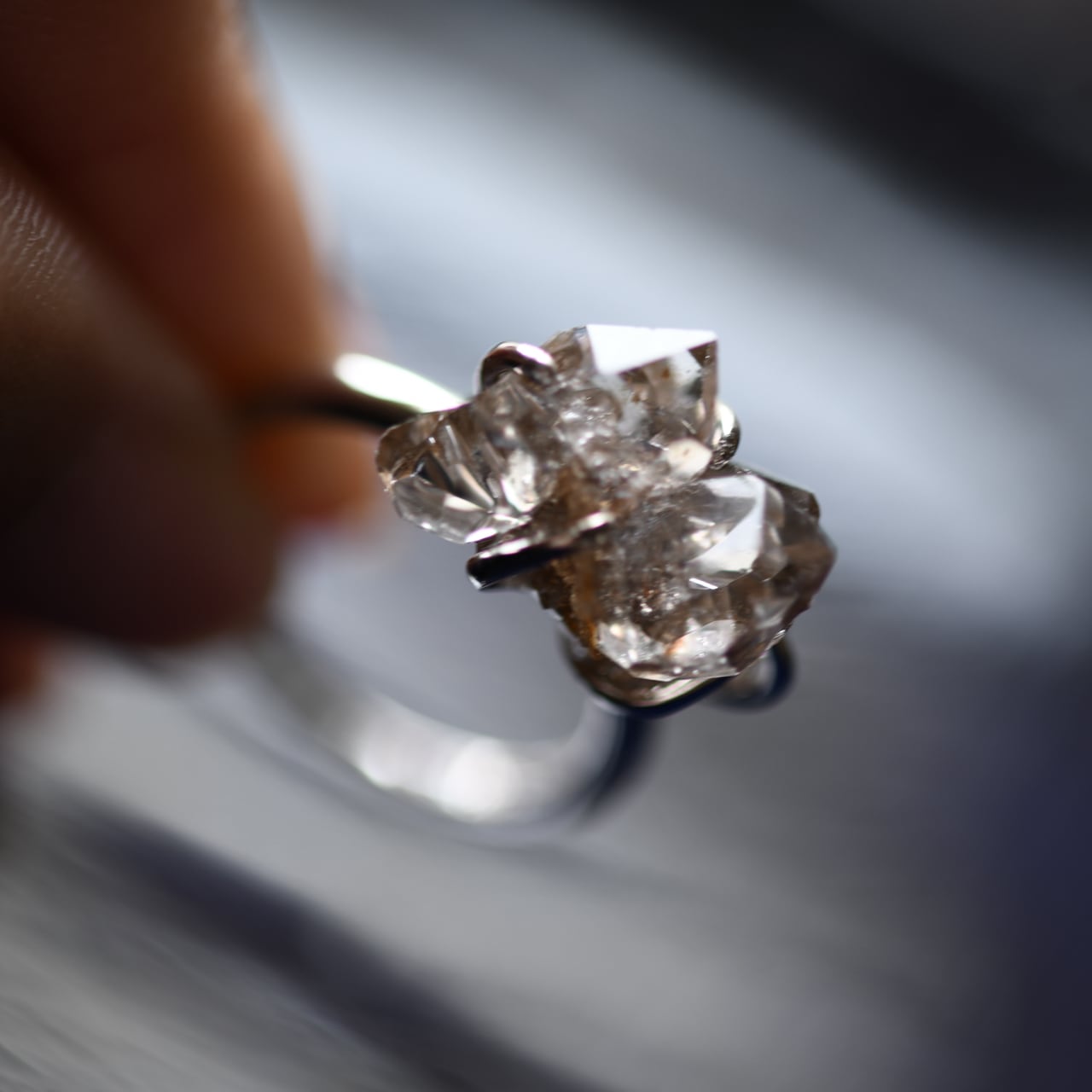 複数のハーキマーハーキマーダイヤモンドが群生している形状をそのままリングに仕立てました。