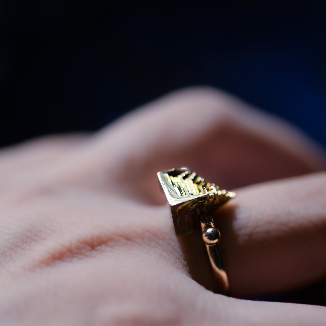 人工的に作ったビスマスの結晶を使用しました。黄金色でメタリックな輝きがございます。
