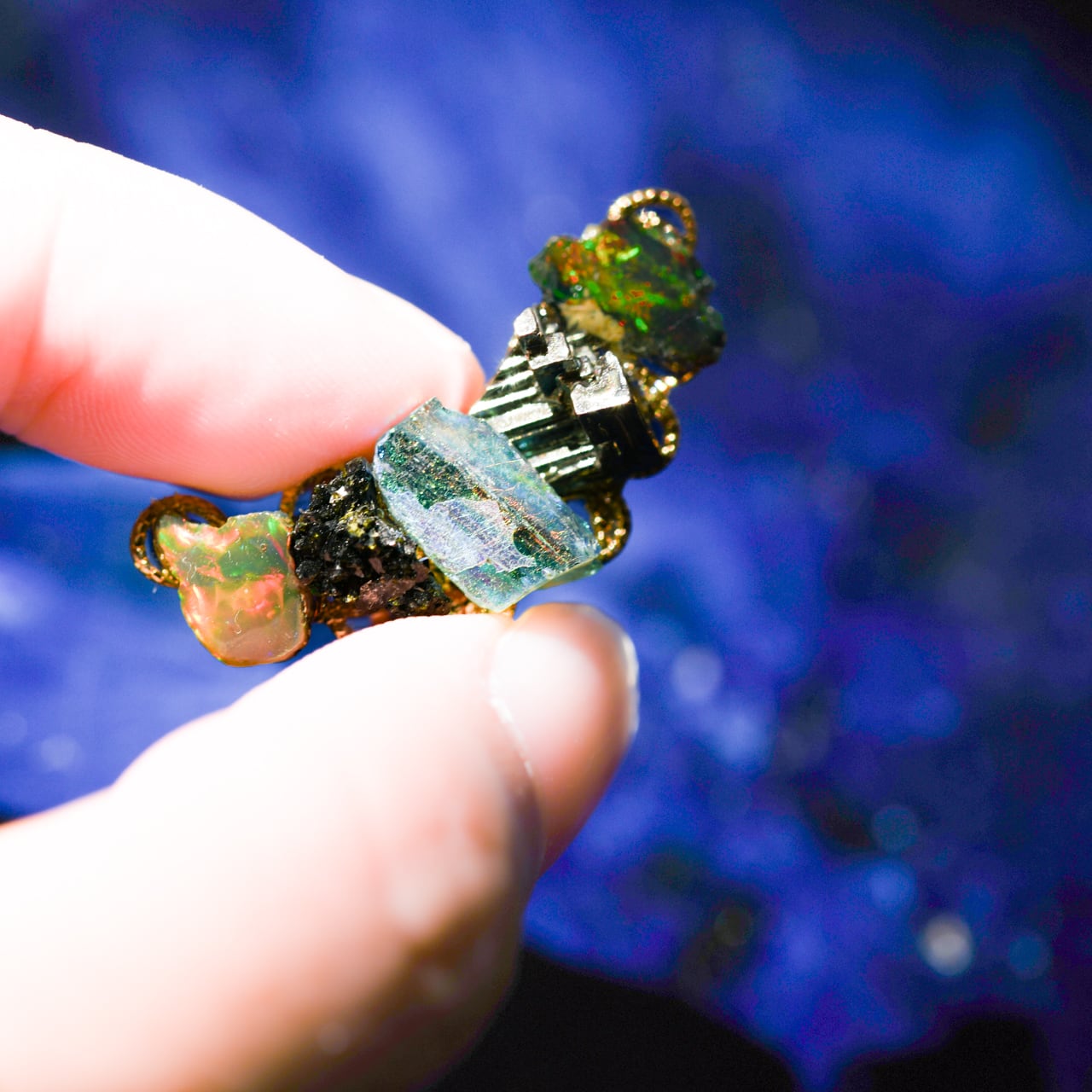 七色に光るローマングラスに、美しい遊色の染色オパール、メタリックに輝くビスマス人工結晶、キラキラと黒く輝くエピトードを使用しました。角度を変えると煌めく鉱物たちをお楽しみ下さい。