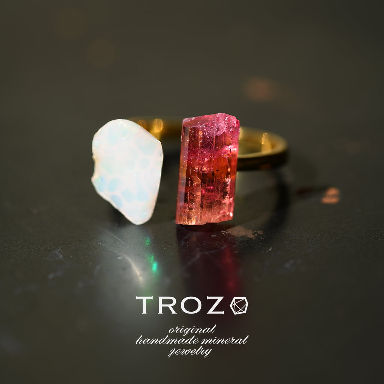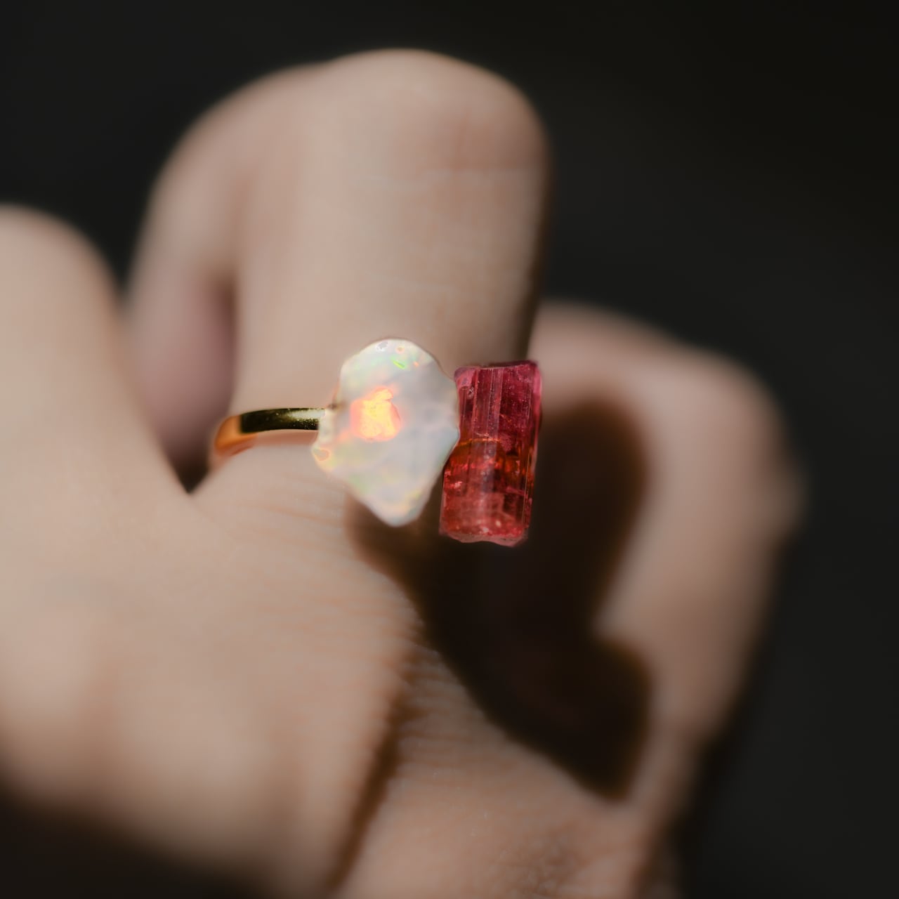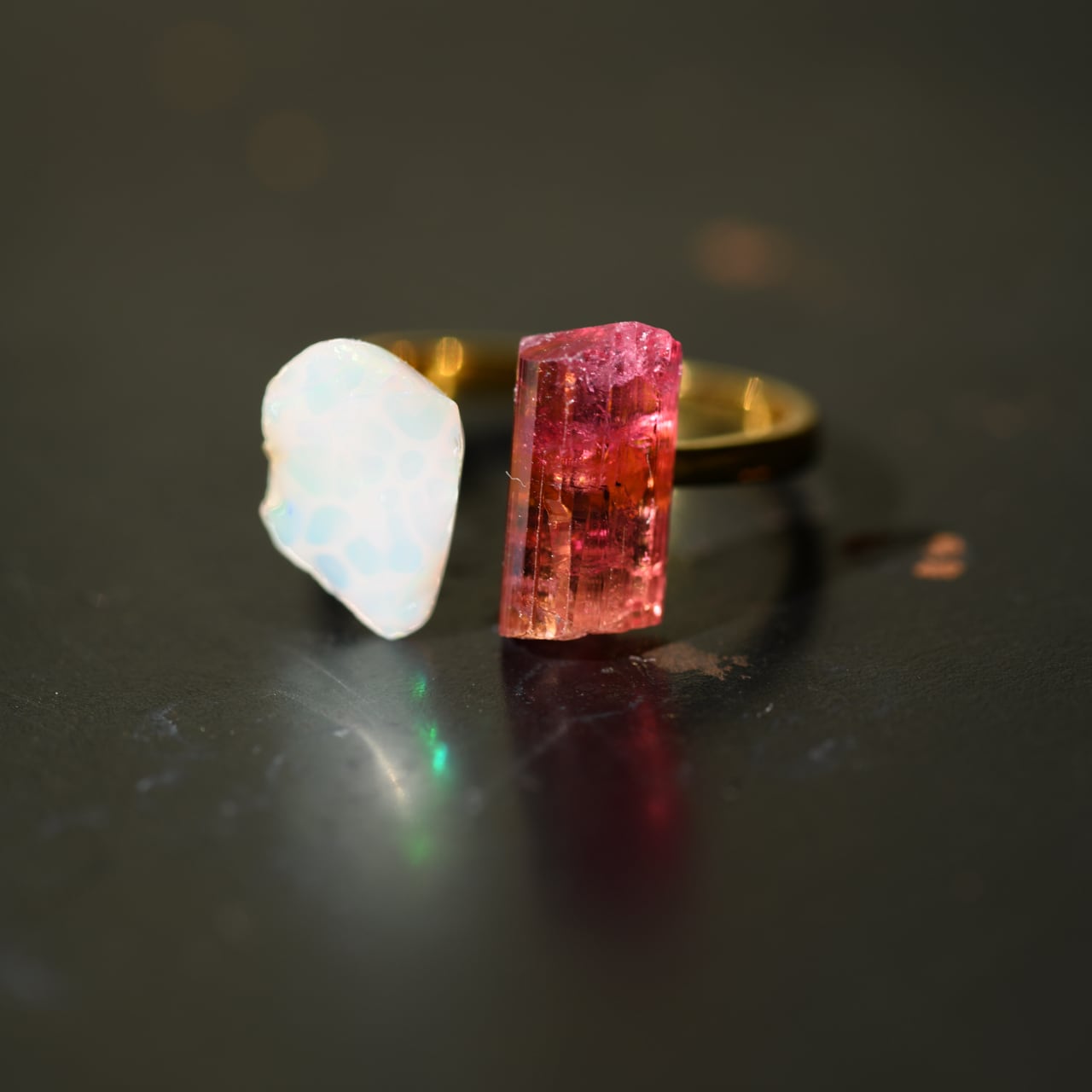 トルマリン × オパールの原石を使用したシルバー925のフリーサイズのフォークリングです。