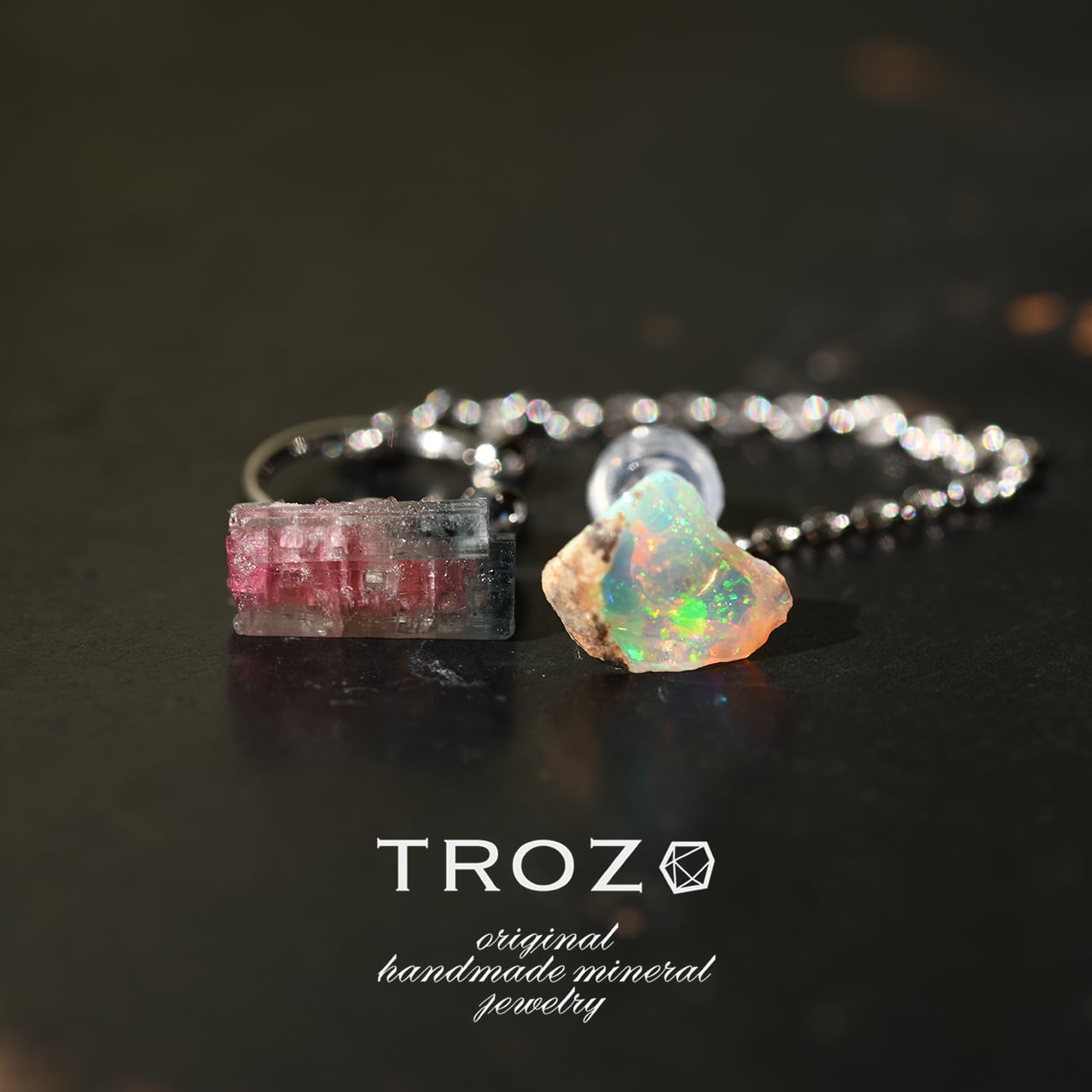トルマリンはピンクとライトブルーのバイカラーで、オパールは透明感のある乳白色です。キラキラとしたとても美しい七色の遊色が見られます。