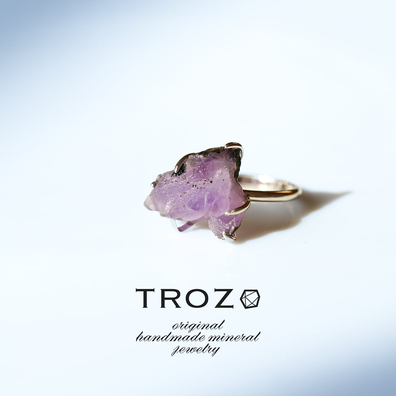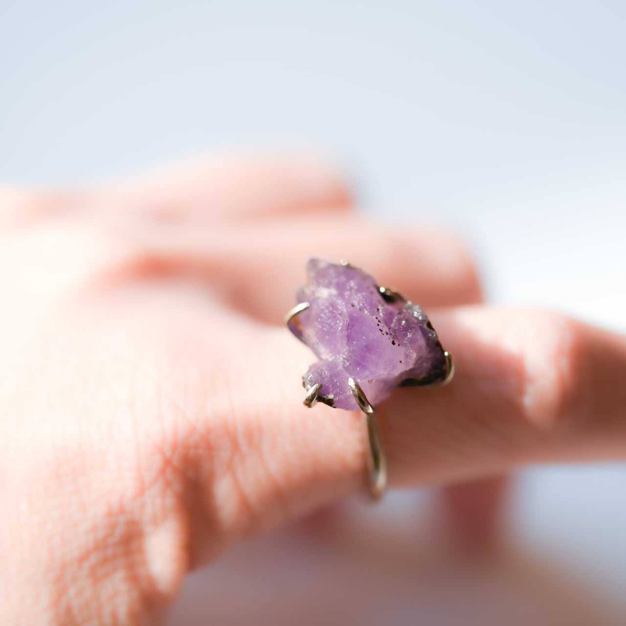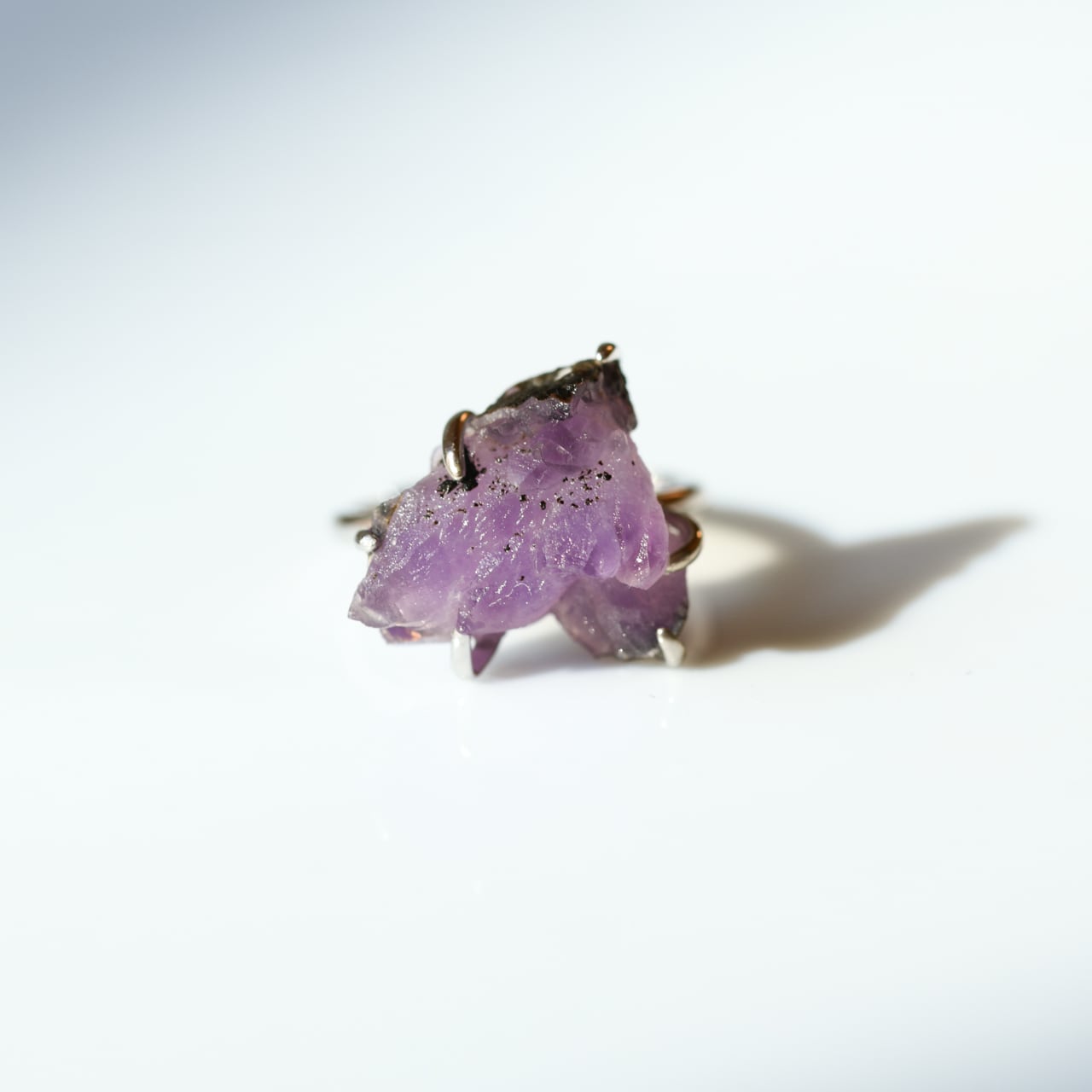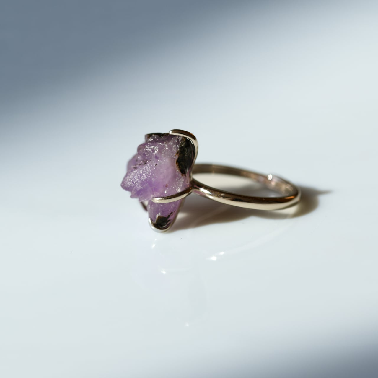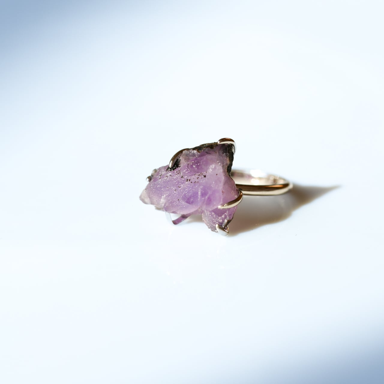 やわらかな紫色が印象的な、原石アメジストを用いた一点もののリング。
