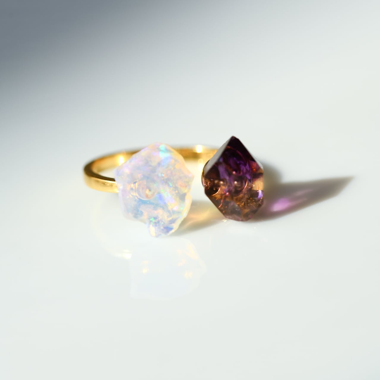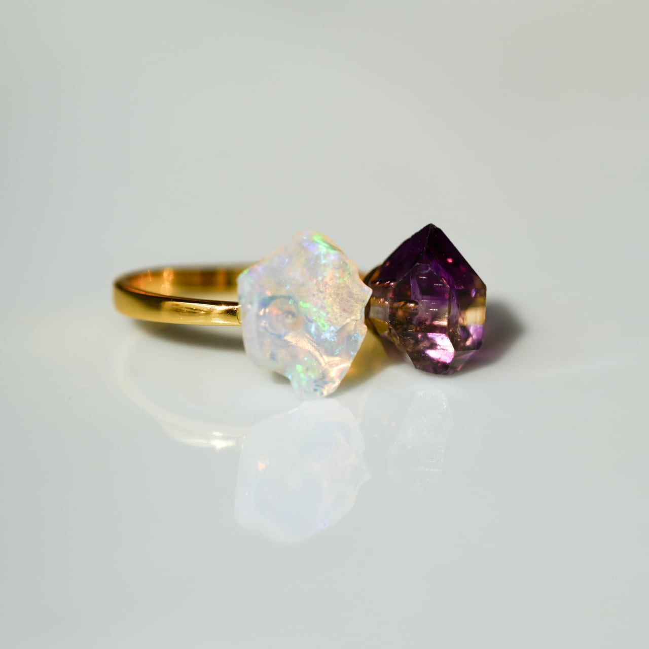 アメシスト (アメジスト) × オパールの原石を使用したシルバー925(ゴールドメッキ)のフリーサイズのリングです。
