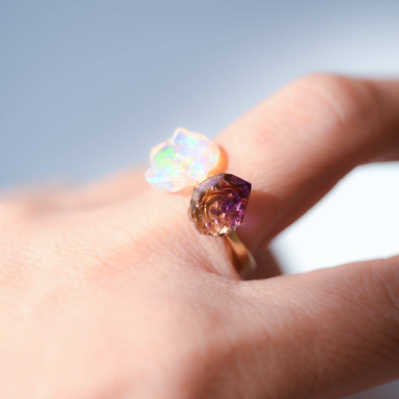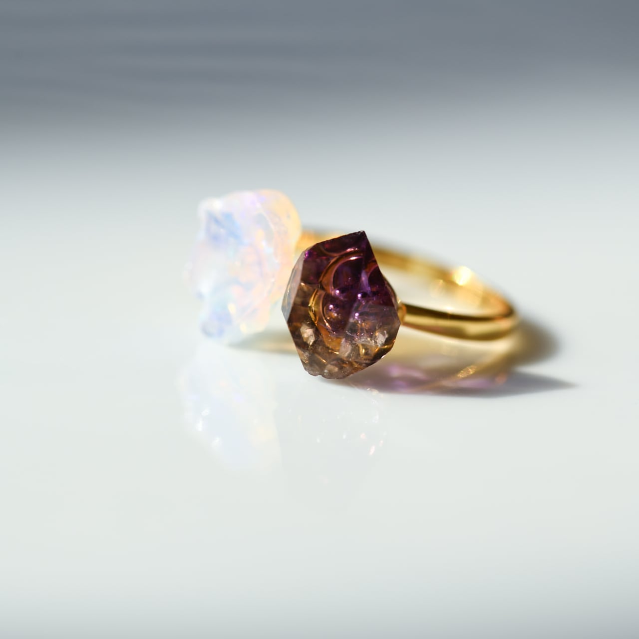 性質の異なる二つの天然石を、フォークリングとしてバランスよく配置した一点もののリングです。
