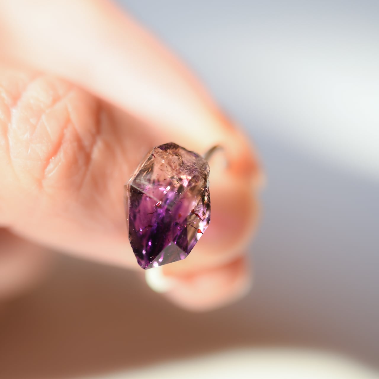 深い紫の奥に、透明感と陰影を併せ持つアメジストは、光の角度によって表情を変え、耳元で静かに存在感を放ちます。