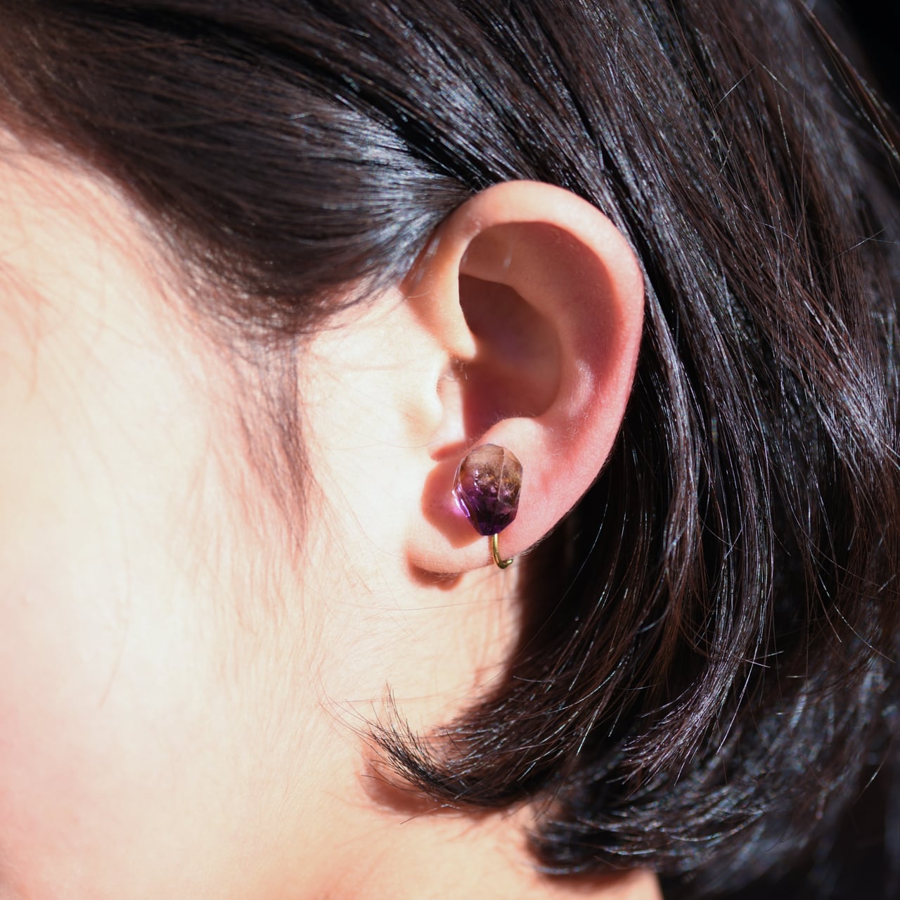深い紫の奥に宿る透明感と陰影。光の角度によって静かに表情を変え、耳元で凛とした存在感を放ちます。華美になりすぎず、シンプルな装いにそっと寄り添いながら、さりげない個性を引き立ててくれる一点です。