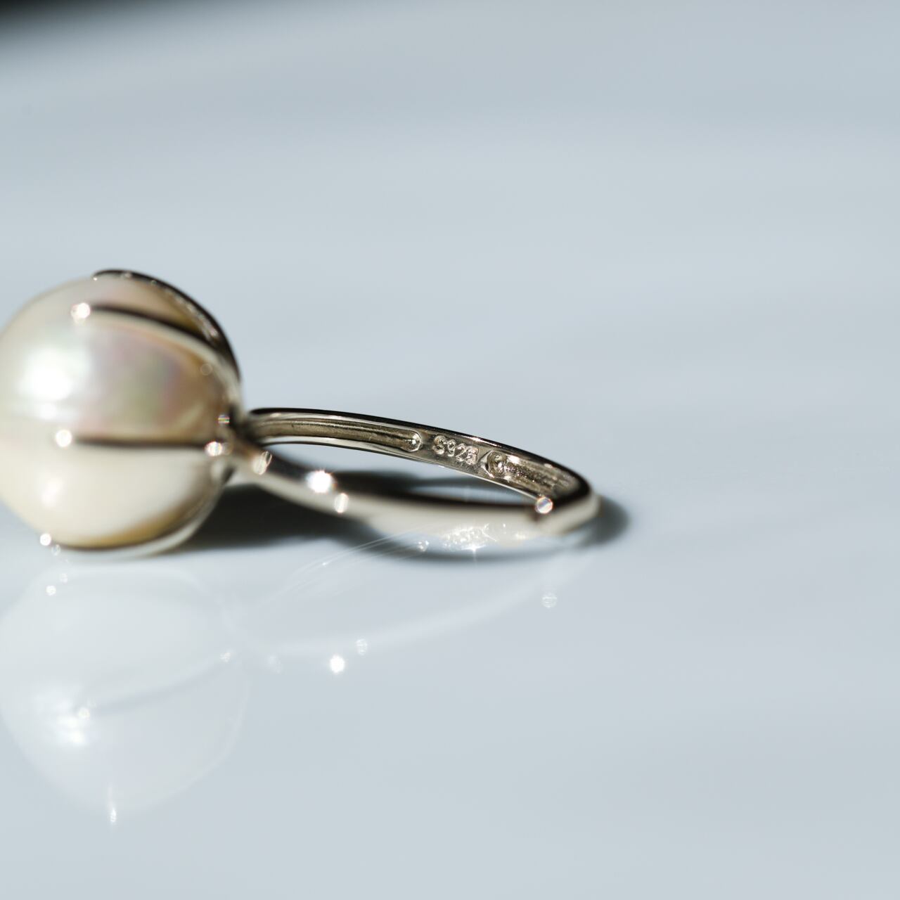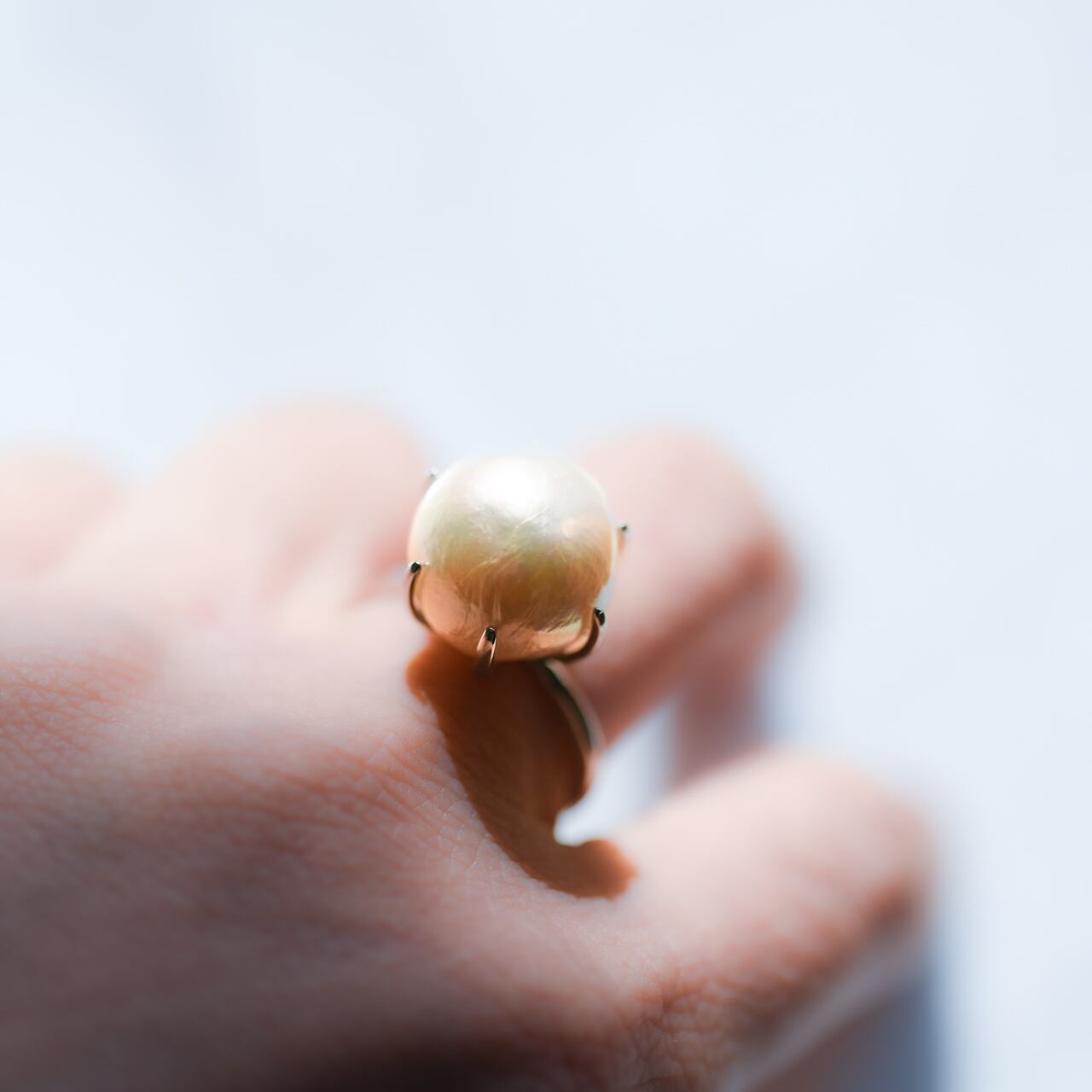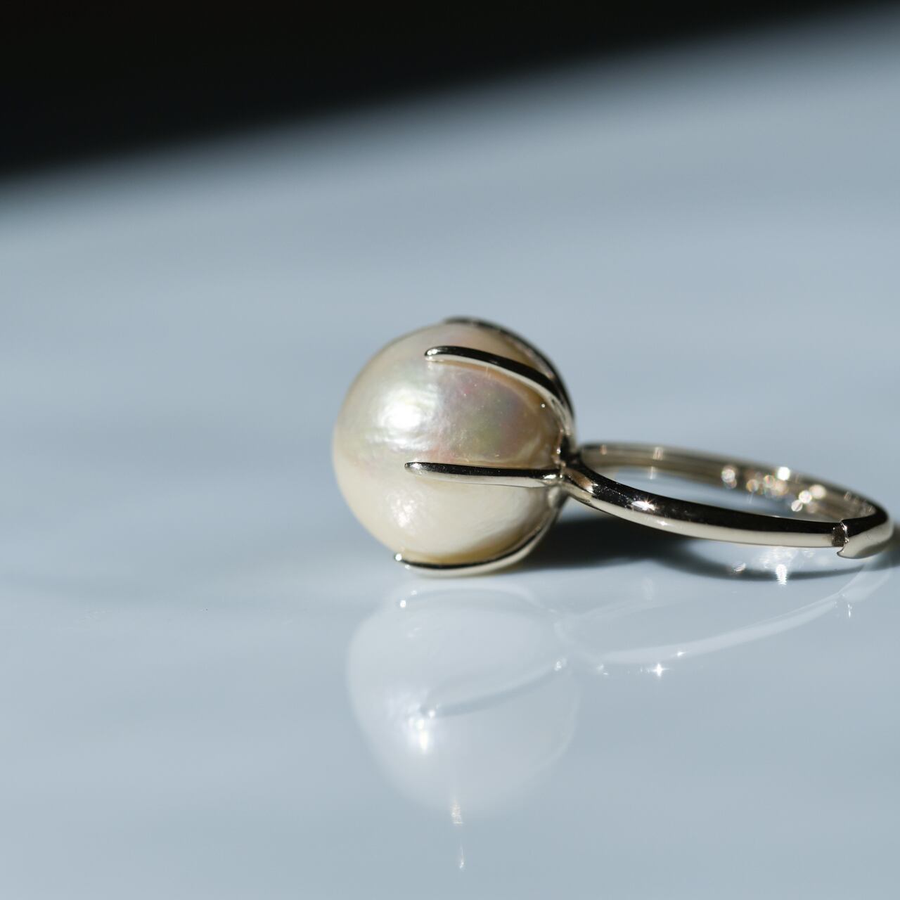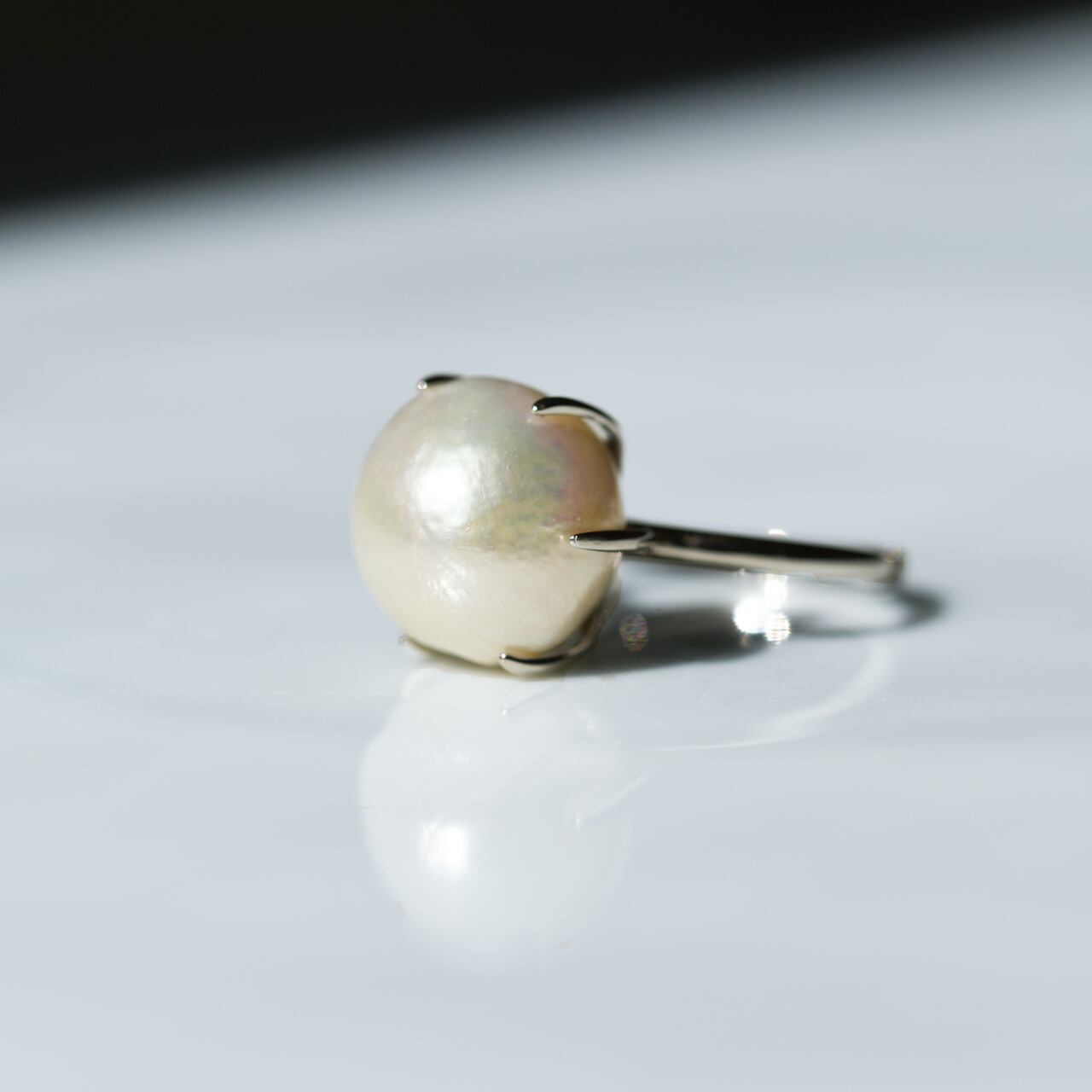 やわらかな虹色の照りを放つ大粒パールを爪留めリングに仕立てました。