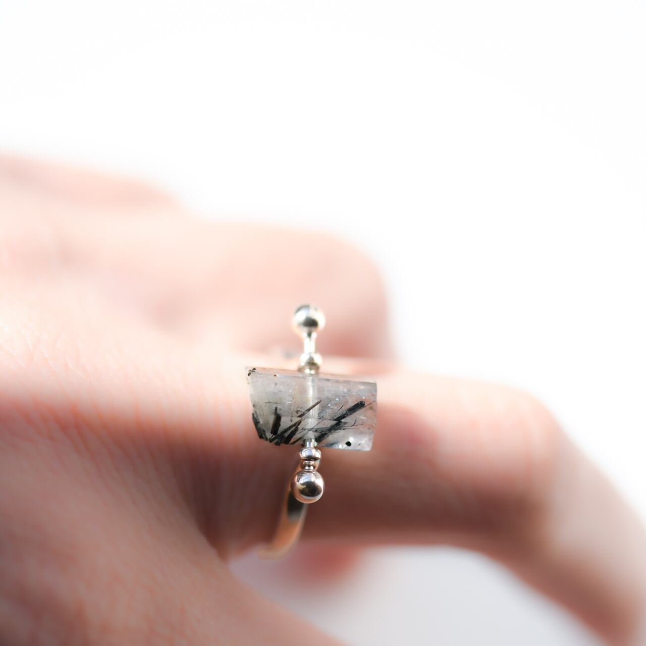 透明感のあるアクアマリンに、ブラックの繊細なインクルージョンが見られます。
