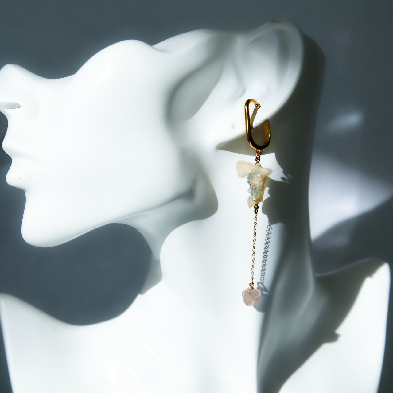 白珊瑚 × アクアマリン × トルマリン × モルガナイト × オパール × ケシパールの原石を使用した揺れるタイプのイヤーカフです。