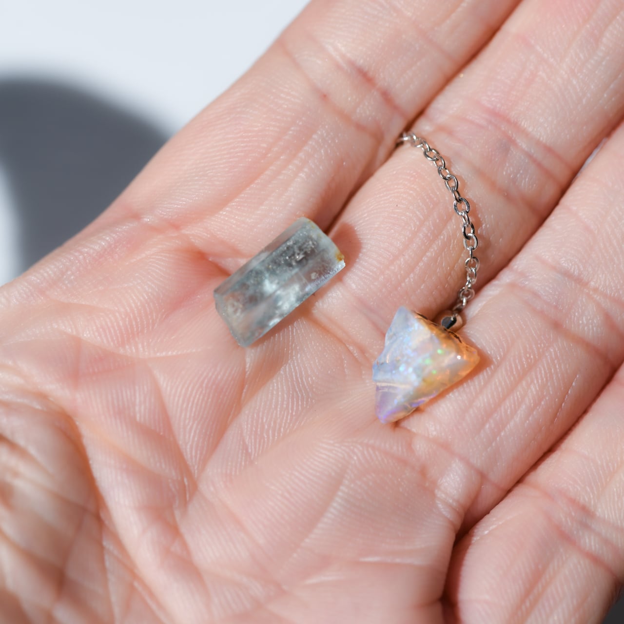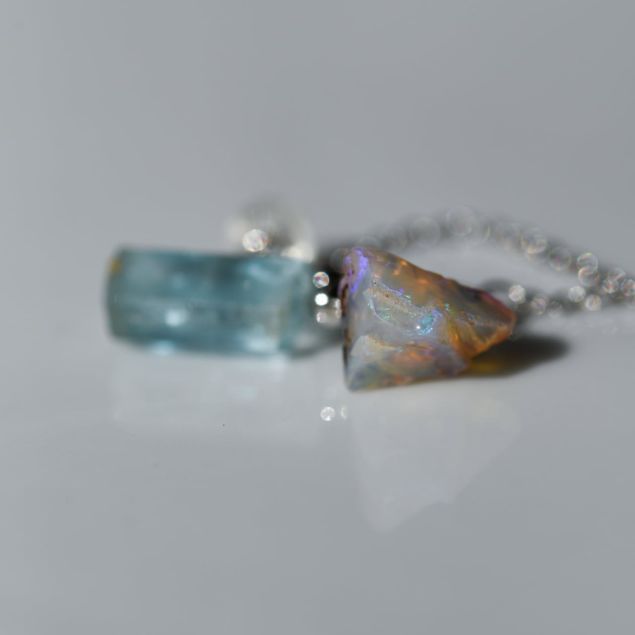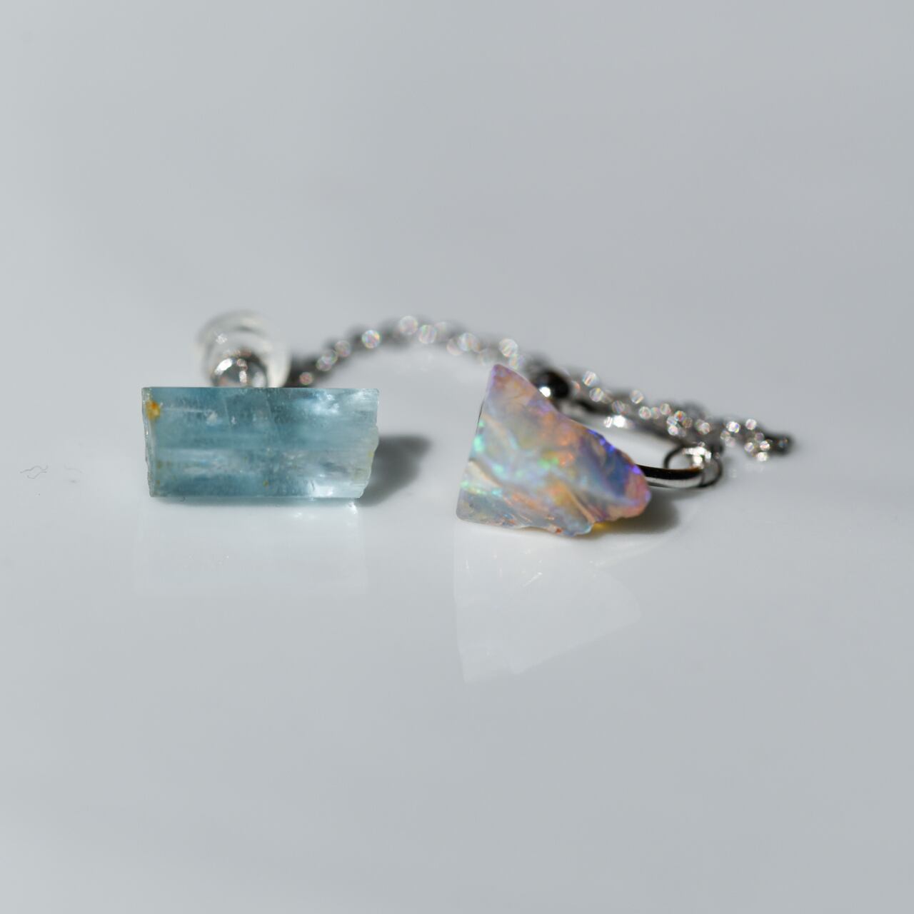 六角柱で澄んだ海のようなブルーのアクアマリンと、透明感があり角度で虹色に揺らぐブラックオパールの組み合わせです。