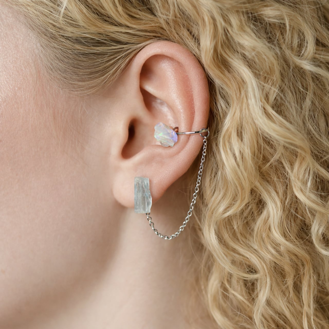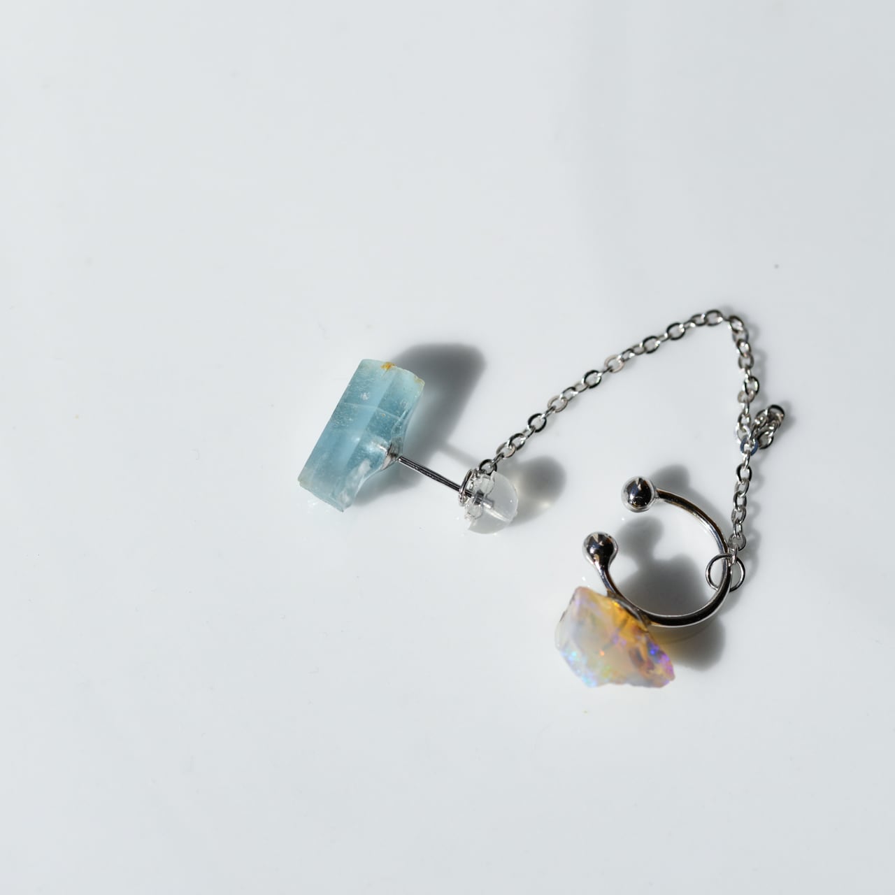 アクアマリン × ブラックオパール の原石を使用した2wayタイプのチェーン付きイヤーカフ&ピアスです。