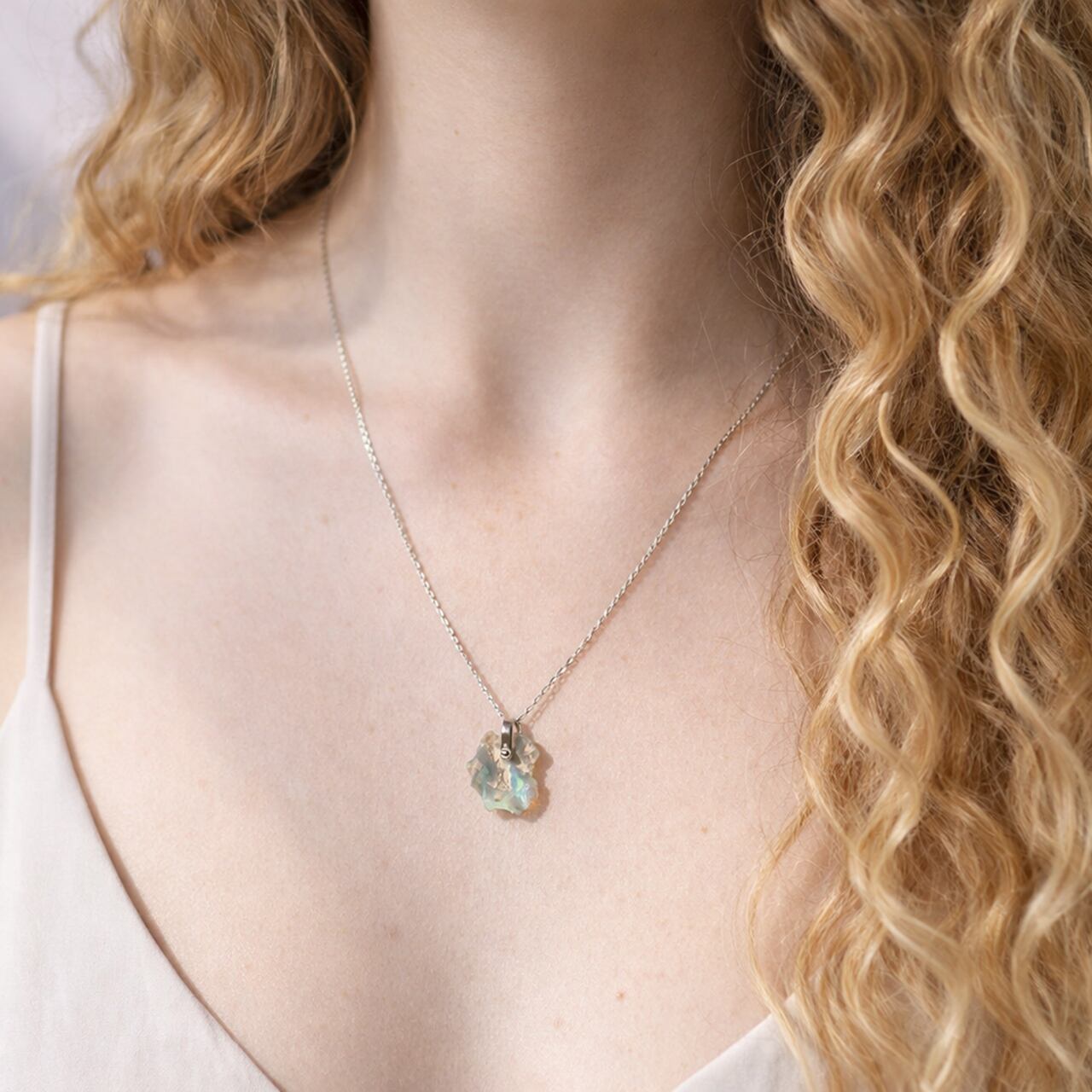 寒色系の遊色が、海の奥で揺れる光のように静かで幻想的です。