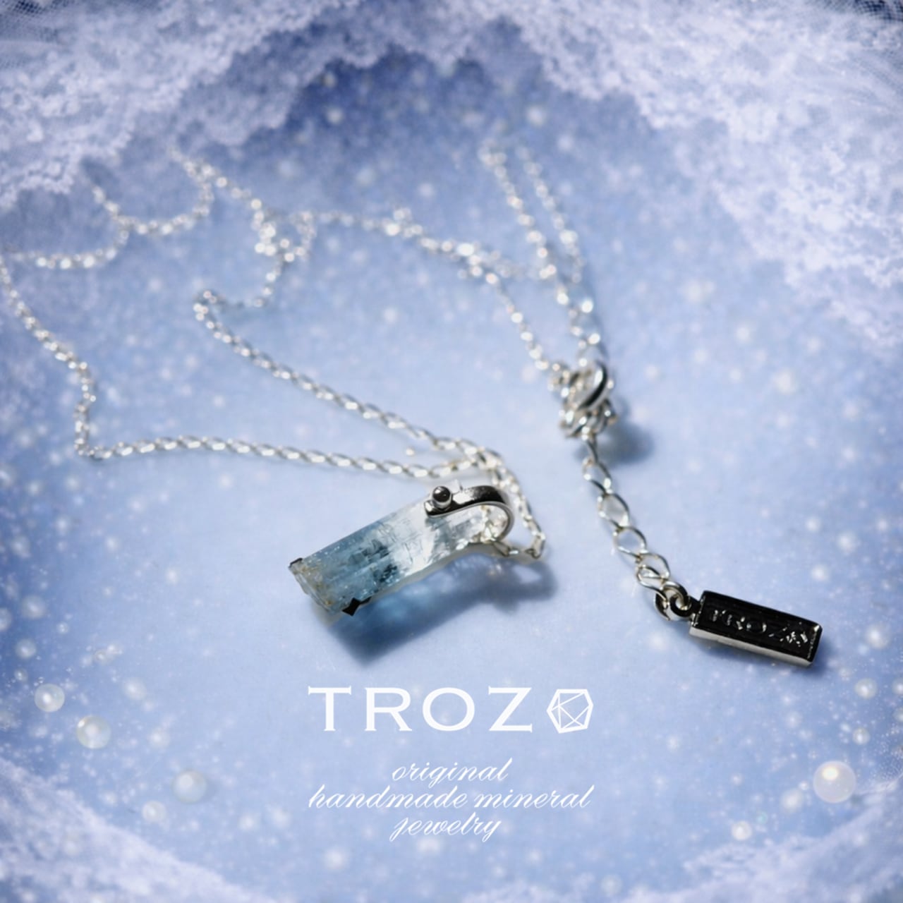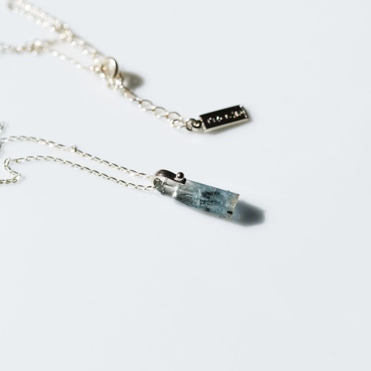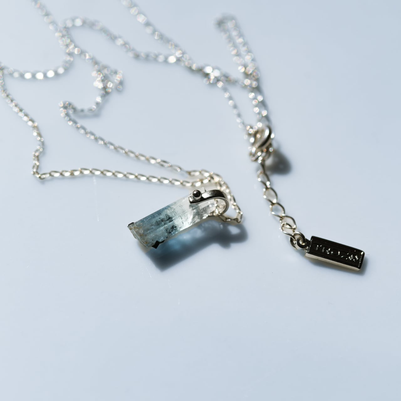 六角柱の淡く澄んだブルーのアクアマリン原石を、そのまま貫通させネックレスに仕立てました。