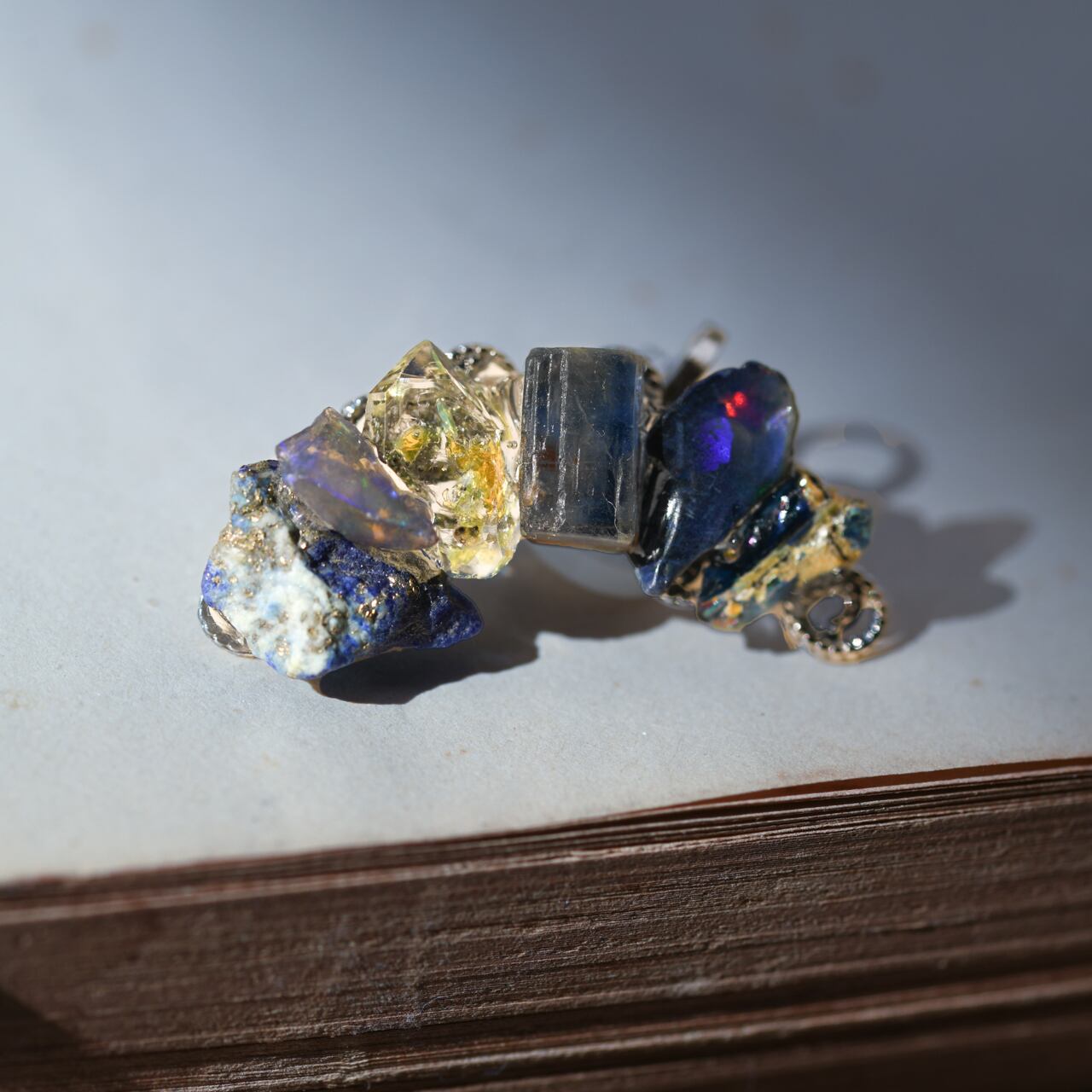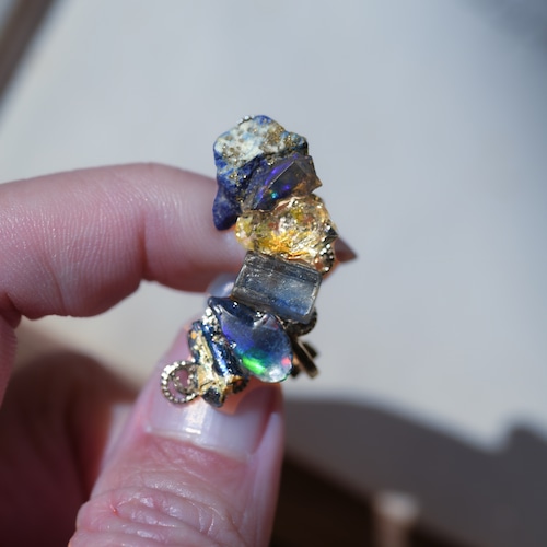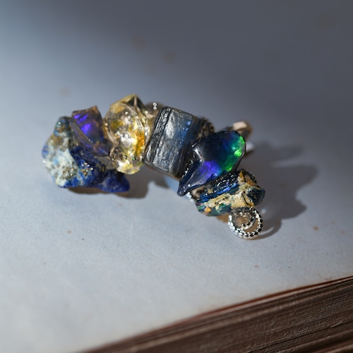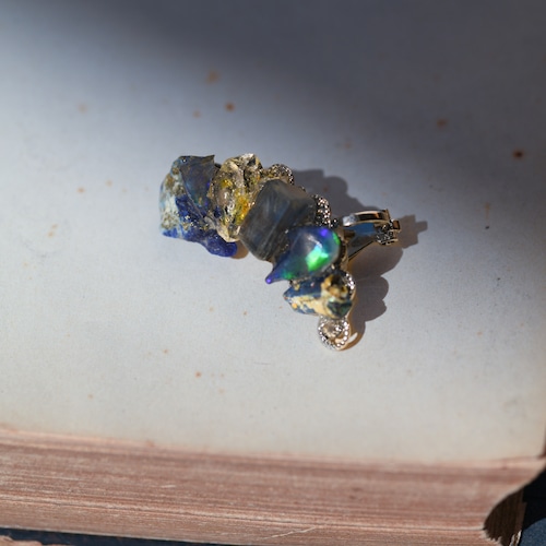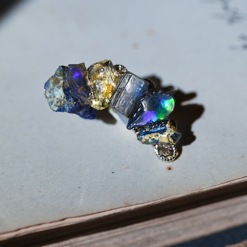 オイルインクォーツ × カイヤナイト × ラピスラズリ × オパール × ローマングラスの原石を使用した挟むタイプのイヤーカフです。