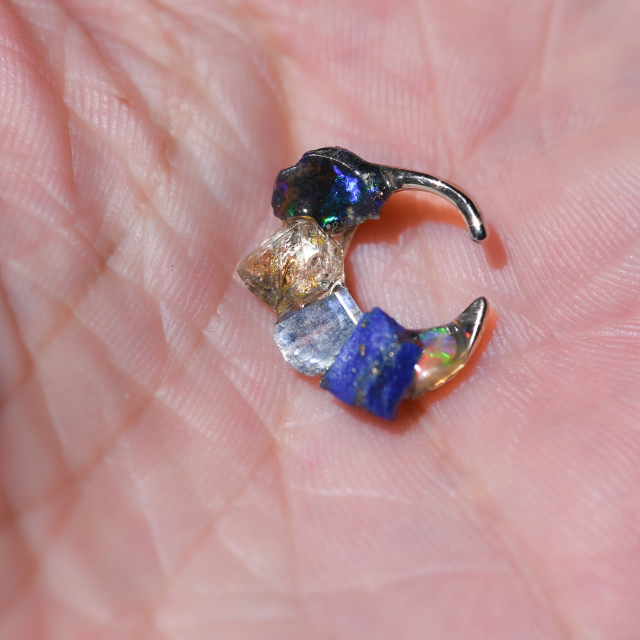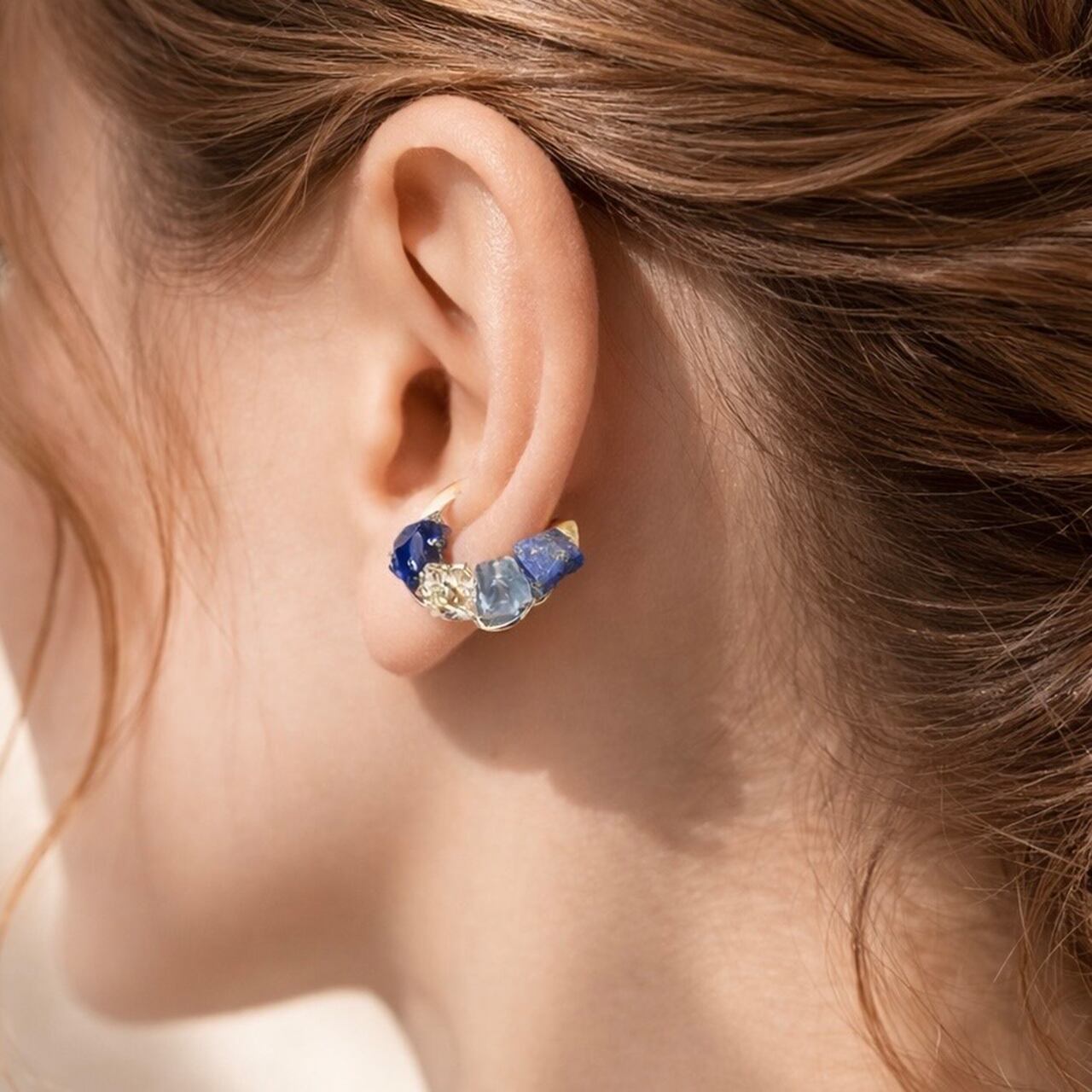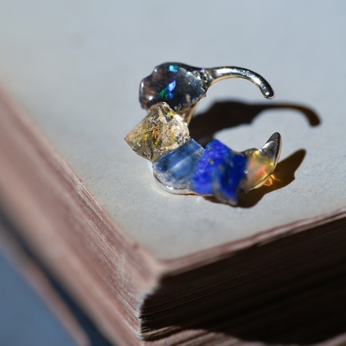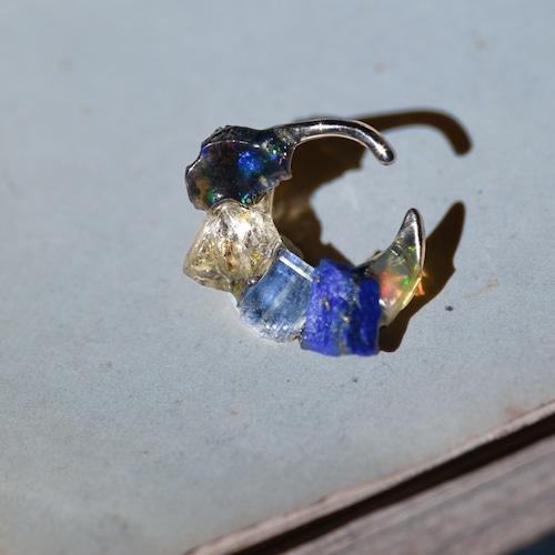 オイルインクォーツ × カイヤナイト × ラピスラズリ × オパールの原石を使用した円形タイプのイヤーカフです。