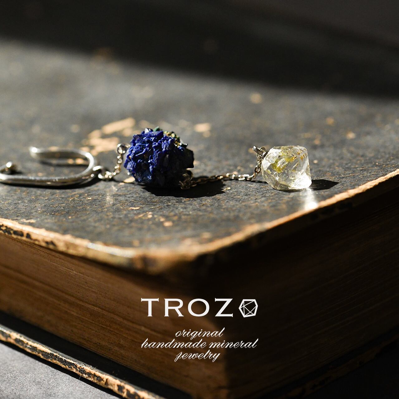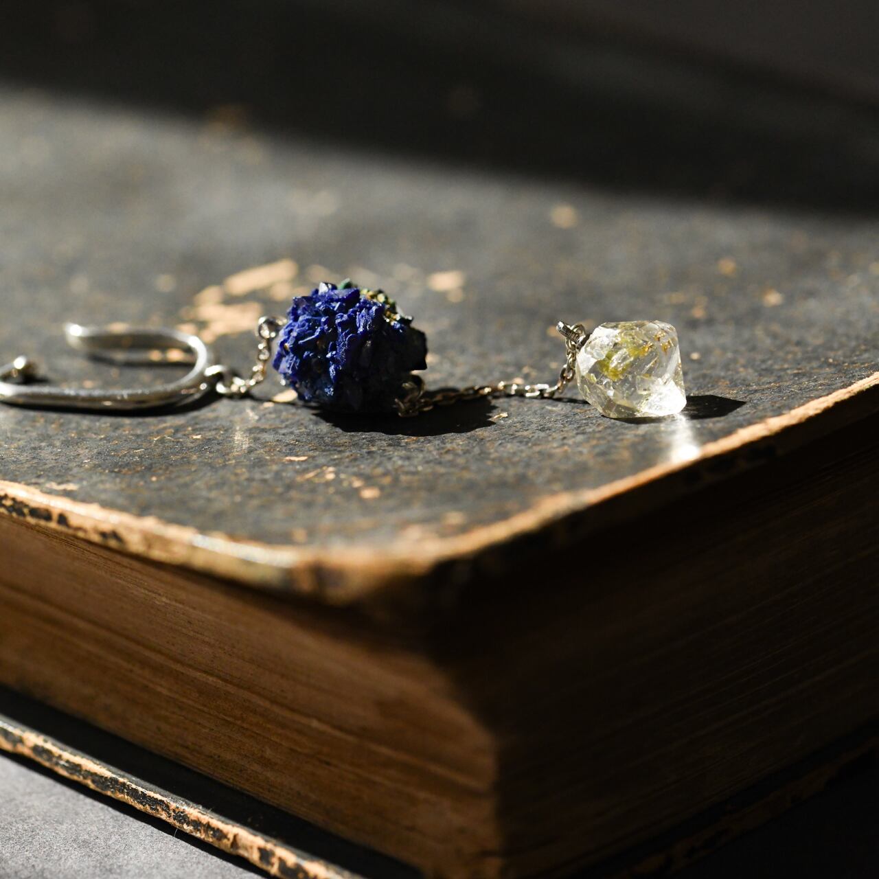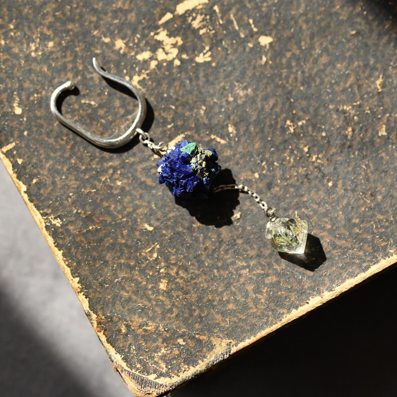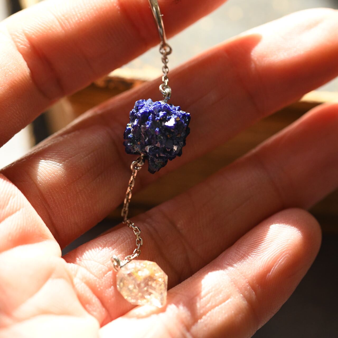 結晶の凹凸が美しいアズライトは、鉱物そのものの力強さを感じさせ、その下で揺れるオイルインクォーツは、繊細な輝きを添えてくれます。