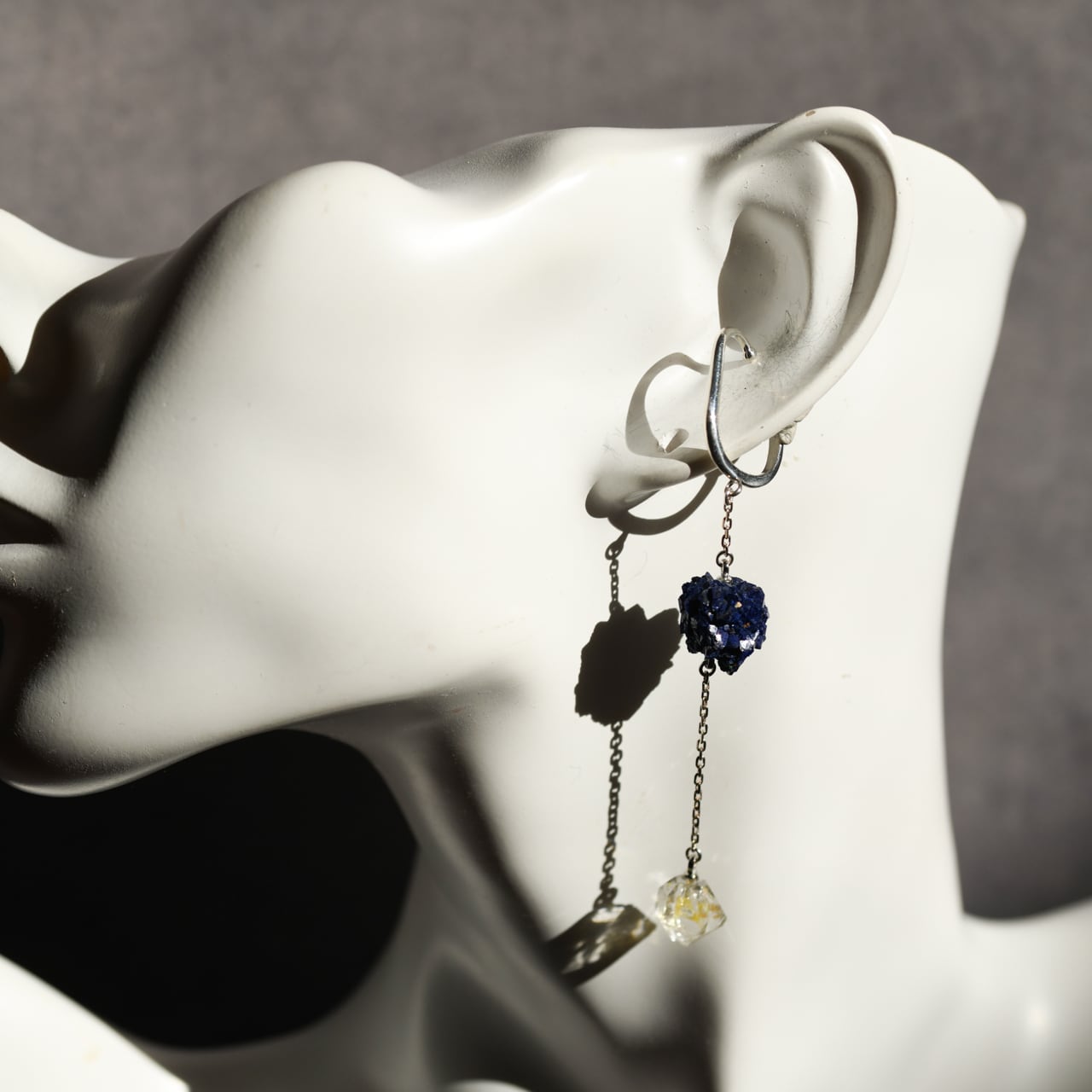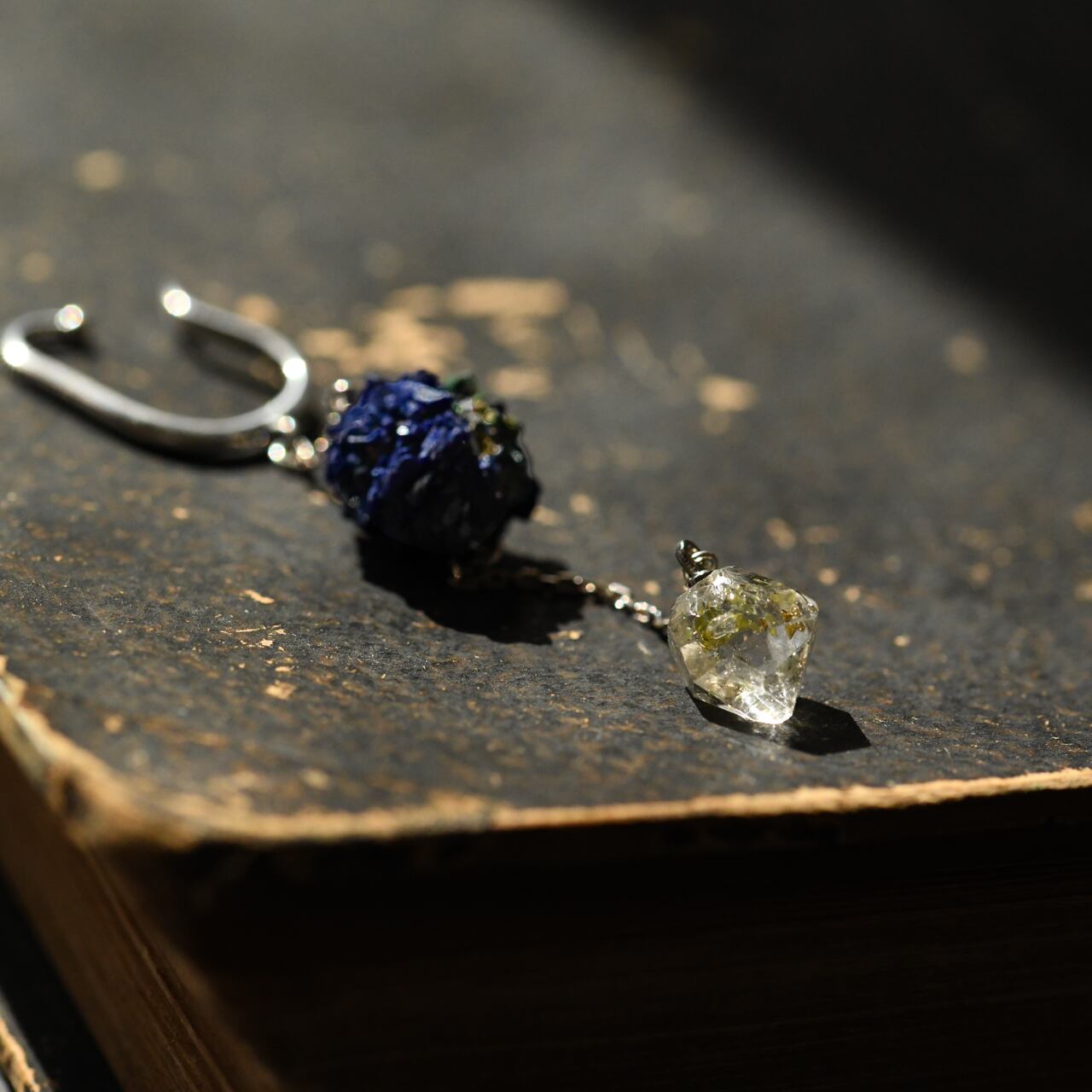 深く濃いブルーのアズライトと、透明感抜群のオイルインクォーツを組み合わせたイヤーカフです。