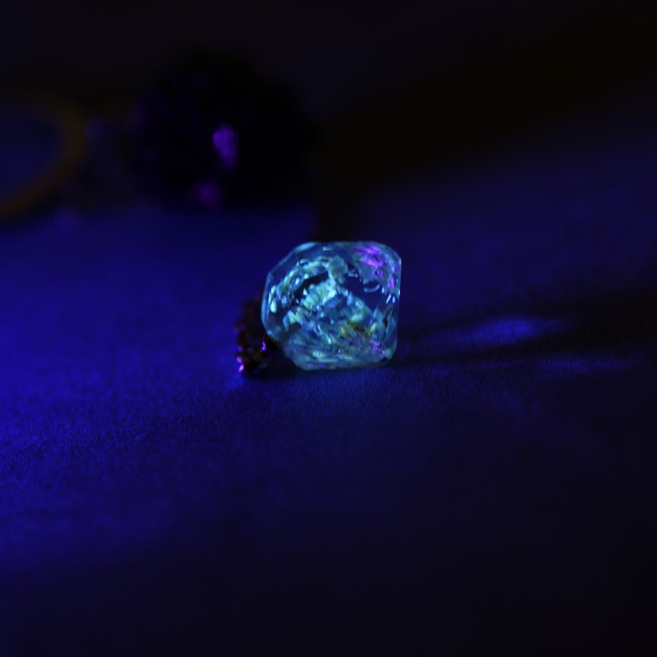 オイルインクォーツはブラックライトを照射すると発光します。