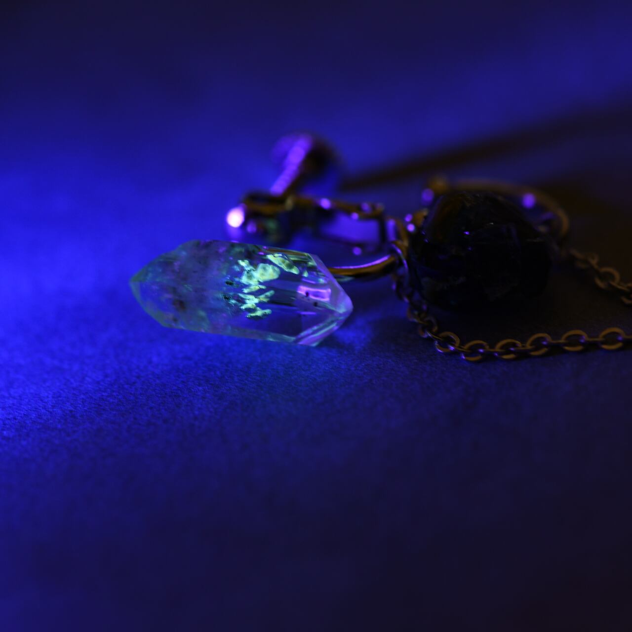 オイルインクォーツはブラックライトを照射すると発光します。