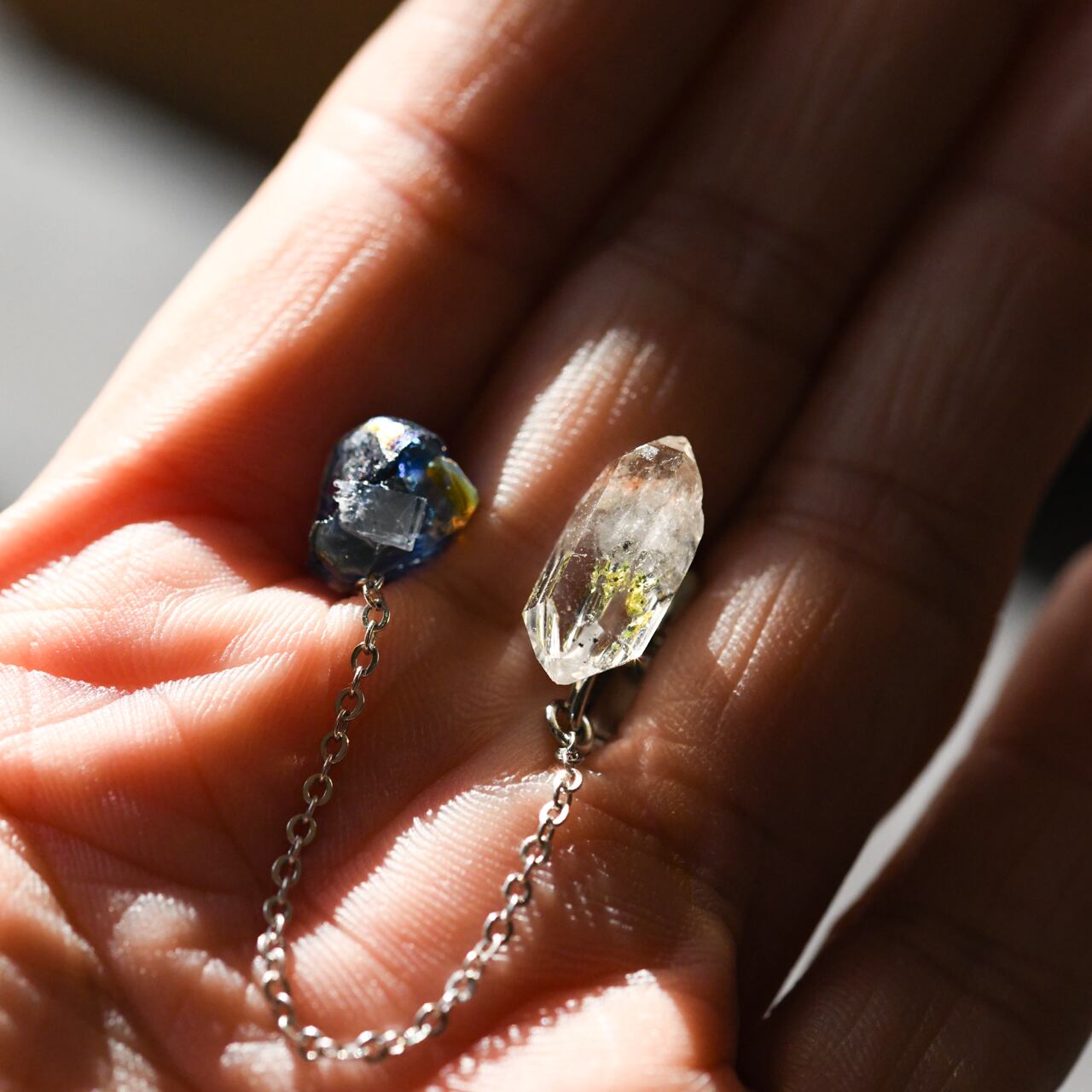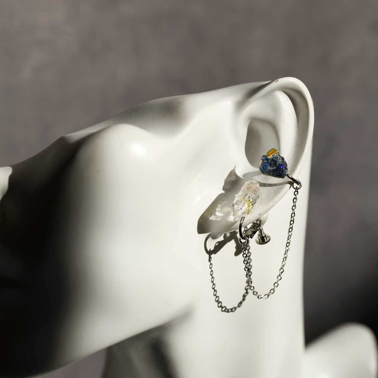 オイルインクォーツ × オパール × ローマングラス × カイヤナイトの原石を使用した2wayタイプのチェーン付きイヤーカフ&イヤリングです。