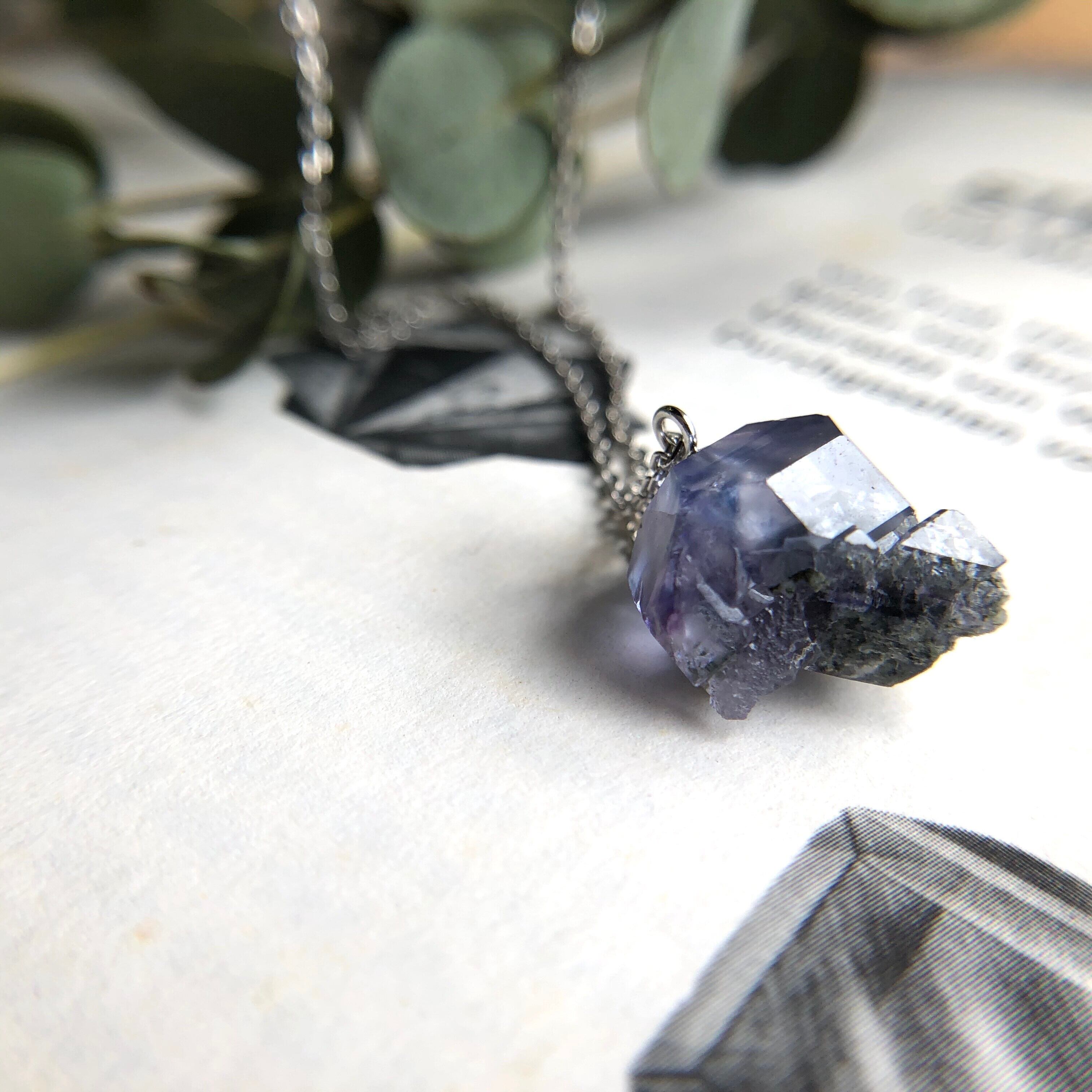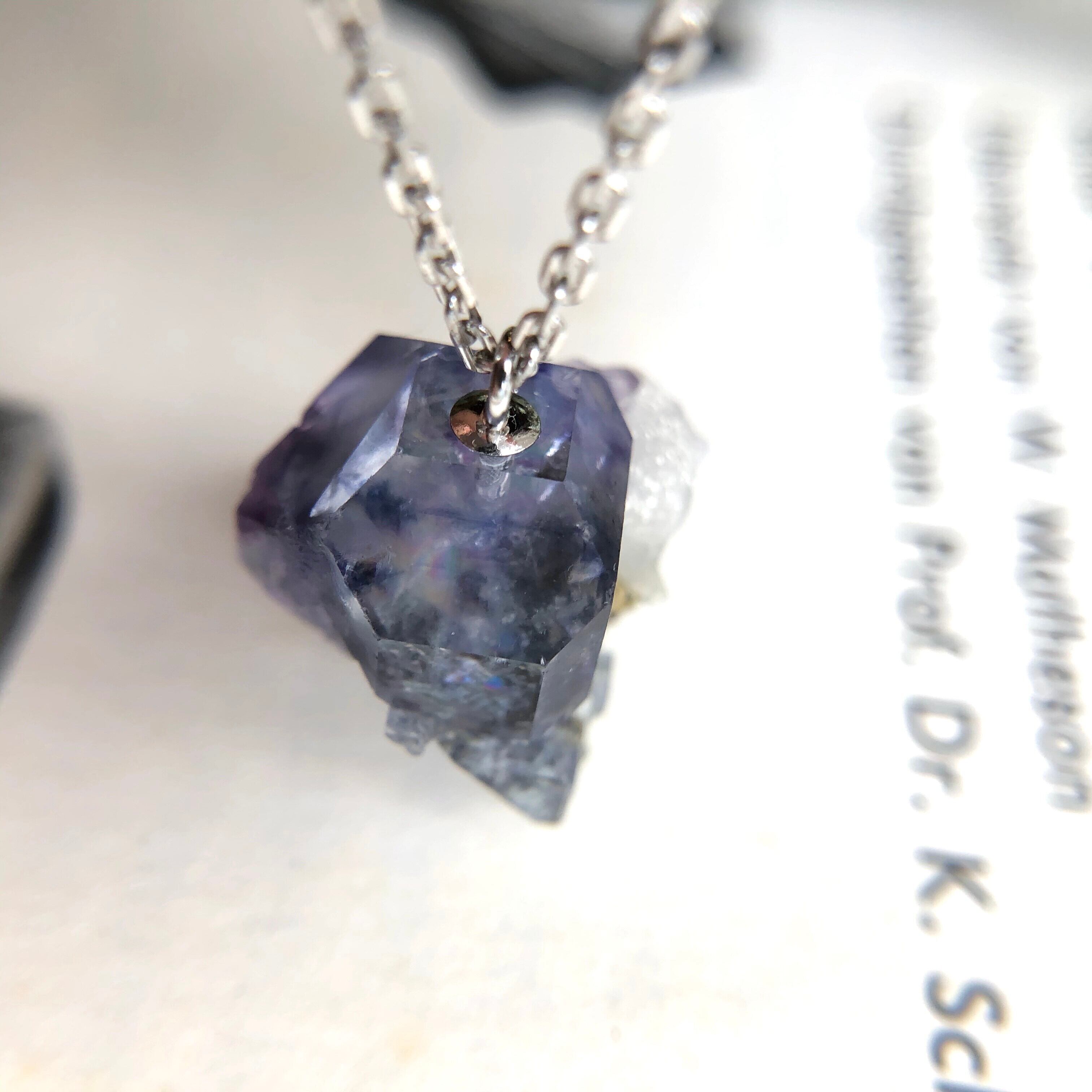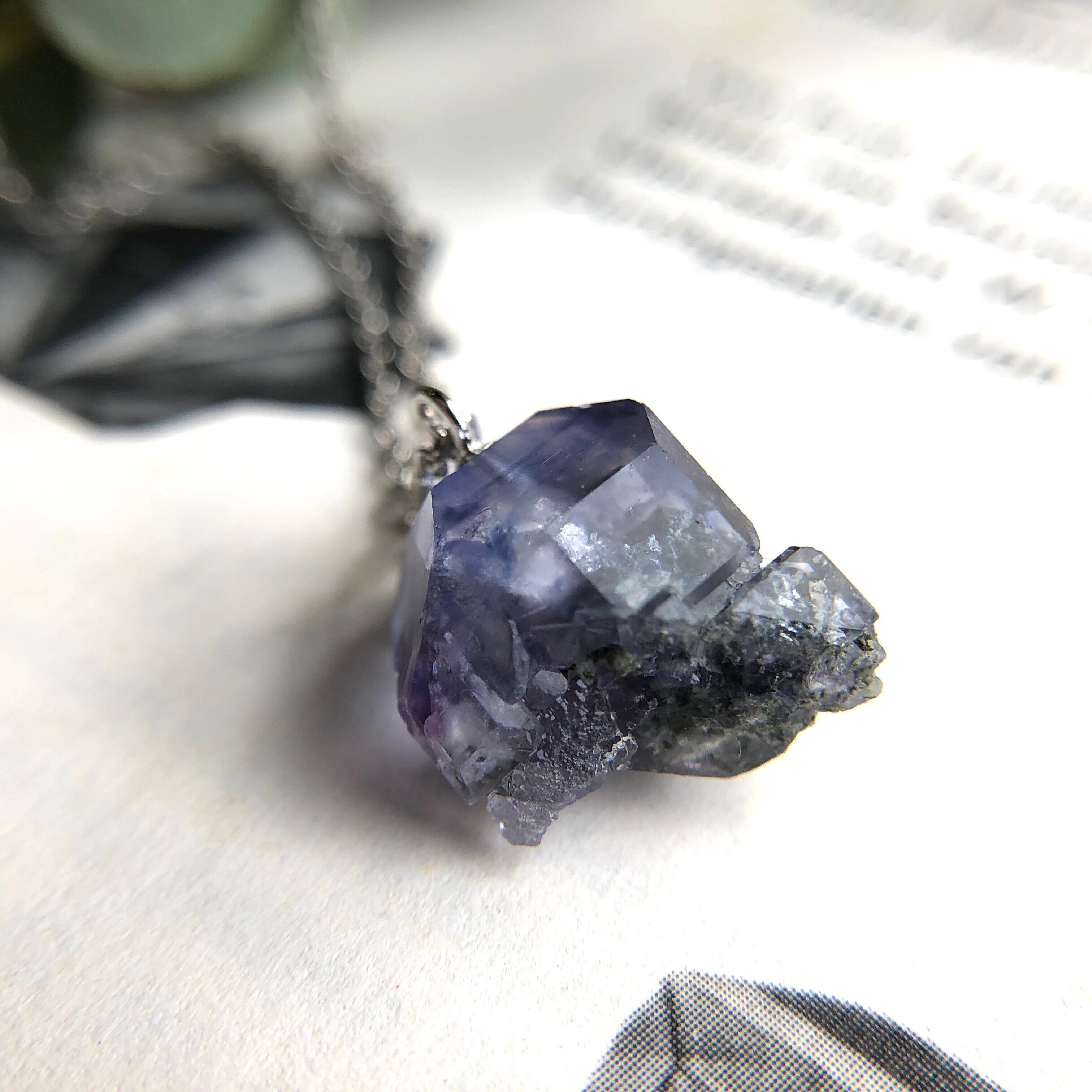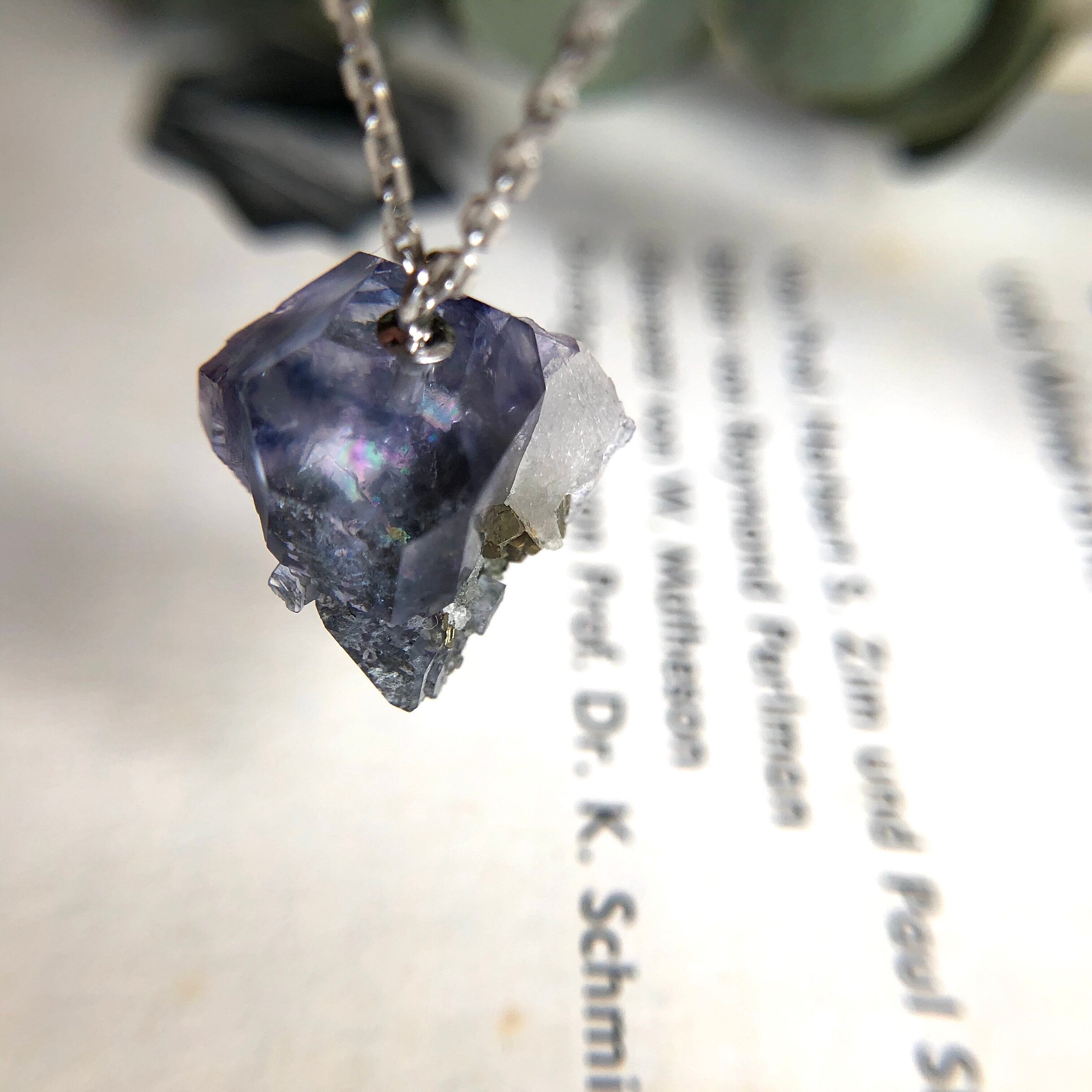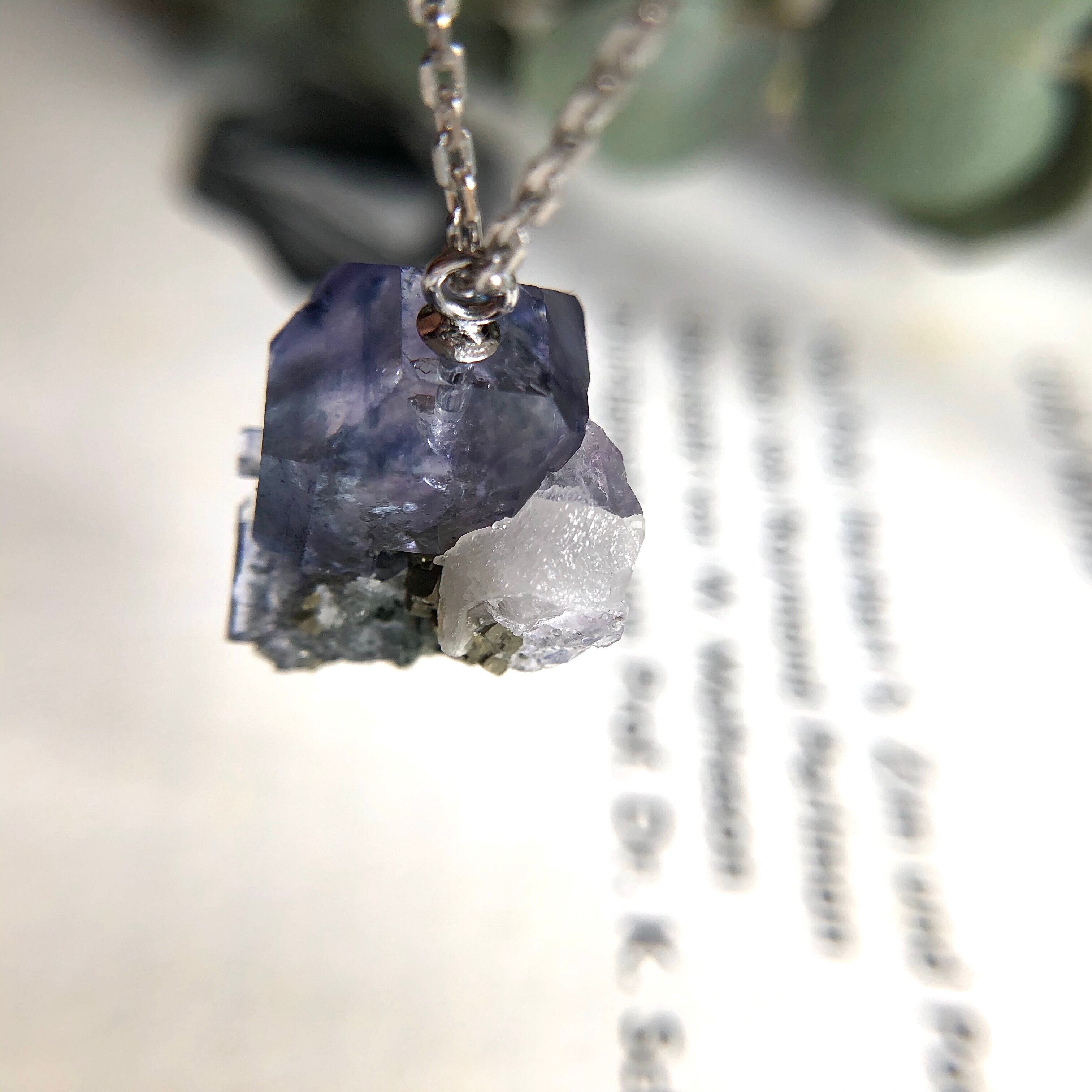 フローライトにクリスタルが付いた原石を仕入れたのでネックレスにしました。フローライトは緑、青、紫、が多いですが、今回仕入れたフローライトはペリウィンクルブルーというパープルとブルーが混ざった色合いです。小さなクリスタルが付いており、原石の良さがとても出ている一点です。原石がお好きな方に大変オススメのネックレスです。ネックレスチェーンはシルバー925 のロジウム加工(酸化しにくい加工)を施しております。そのため通常のシルバーよりも落ち着いた色味になっております。