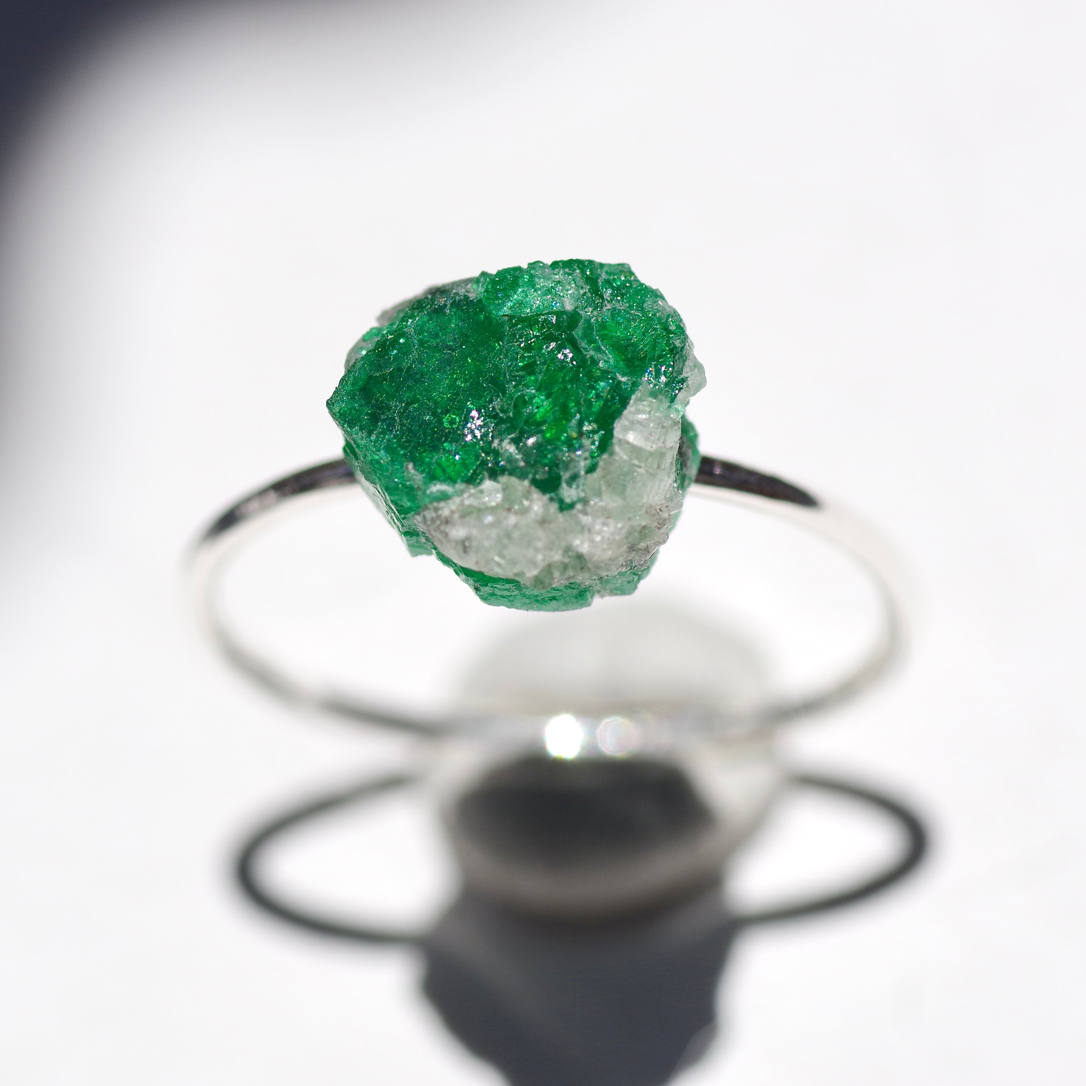 エメラルドの原石を使用したSV925のリングです。 鮮やかなグリーンで、表面に石英が付着しております。小さめなので、他のリングとの重ね付けもし易いです。