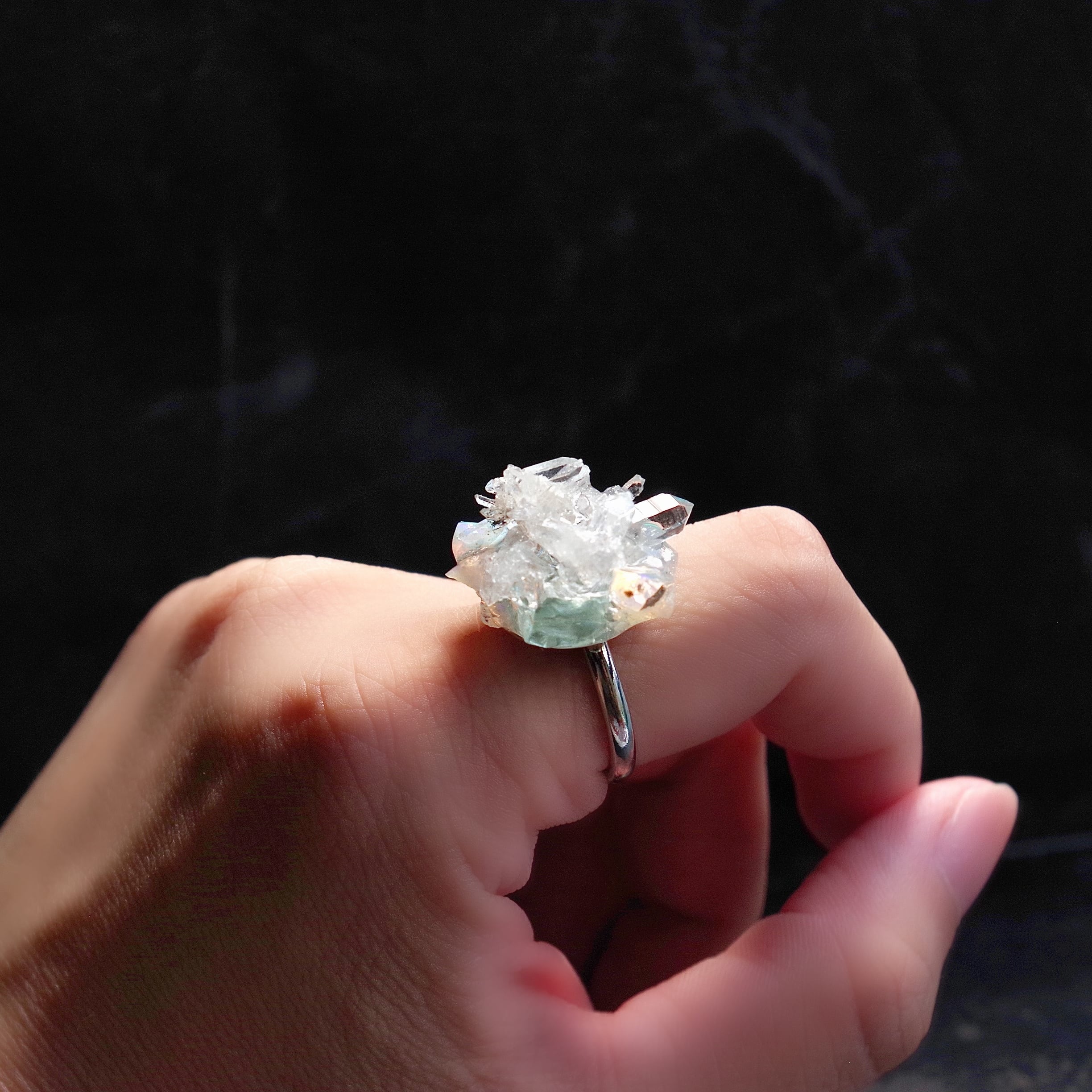 オパール × セレスタイト × アクアマリン × クラスター水晶の原石を使用して指元を飾る氷の結晶を作りました。