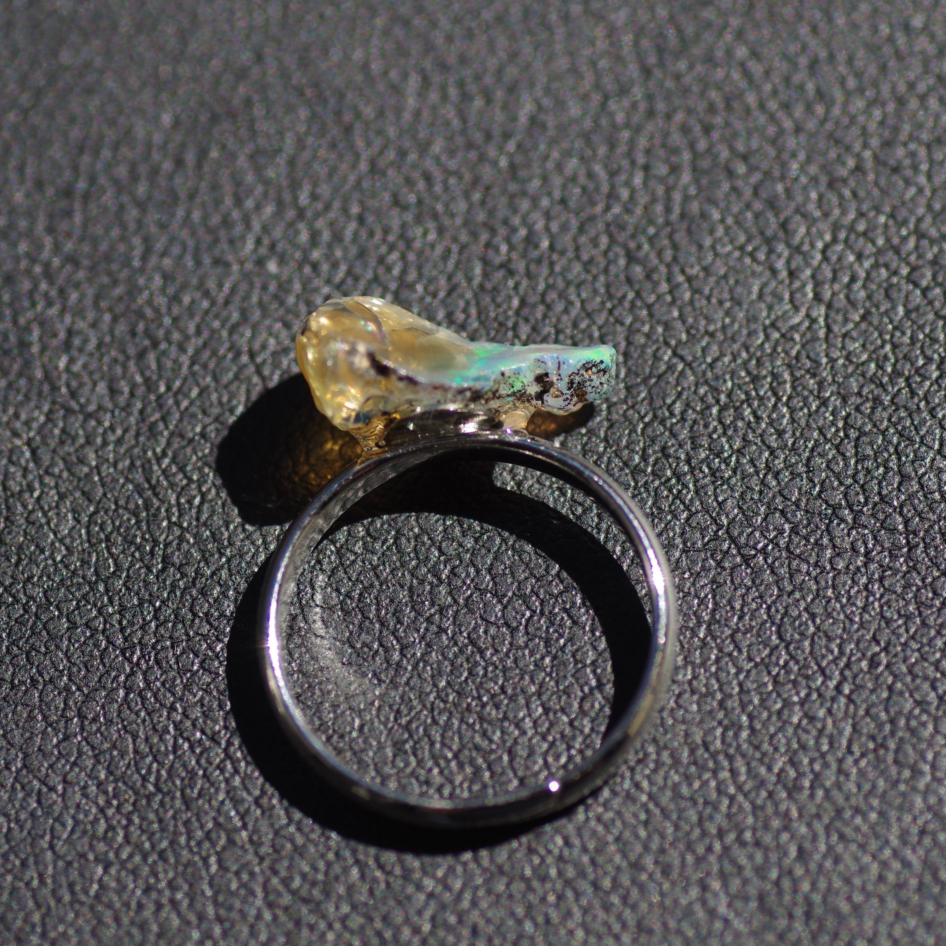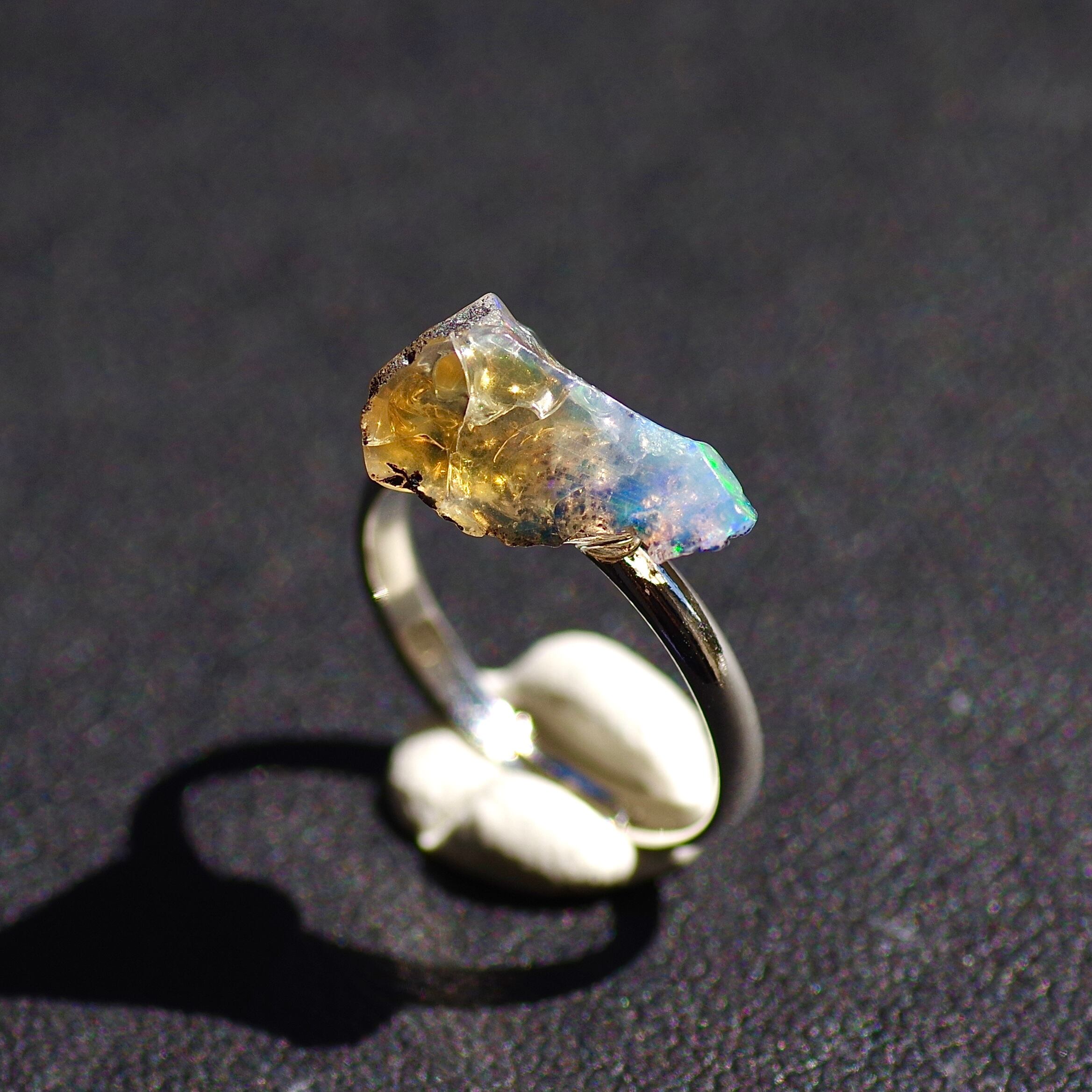 オパールの原石を使用したピンキーリングです。イエロー・乳白色・ブルーが混在した珍しい色合いです。美しい遊色が見られます。