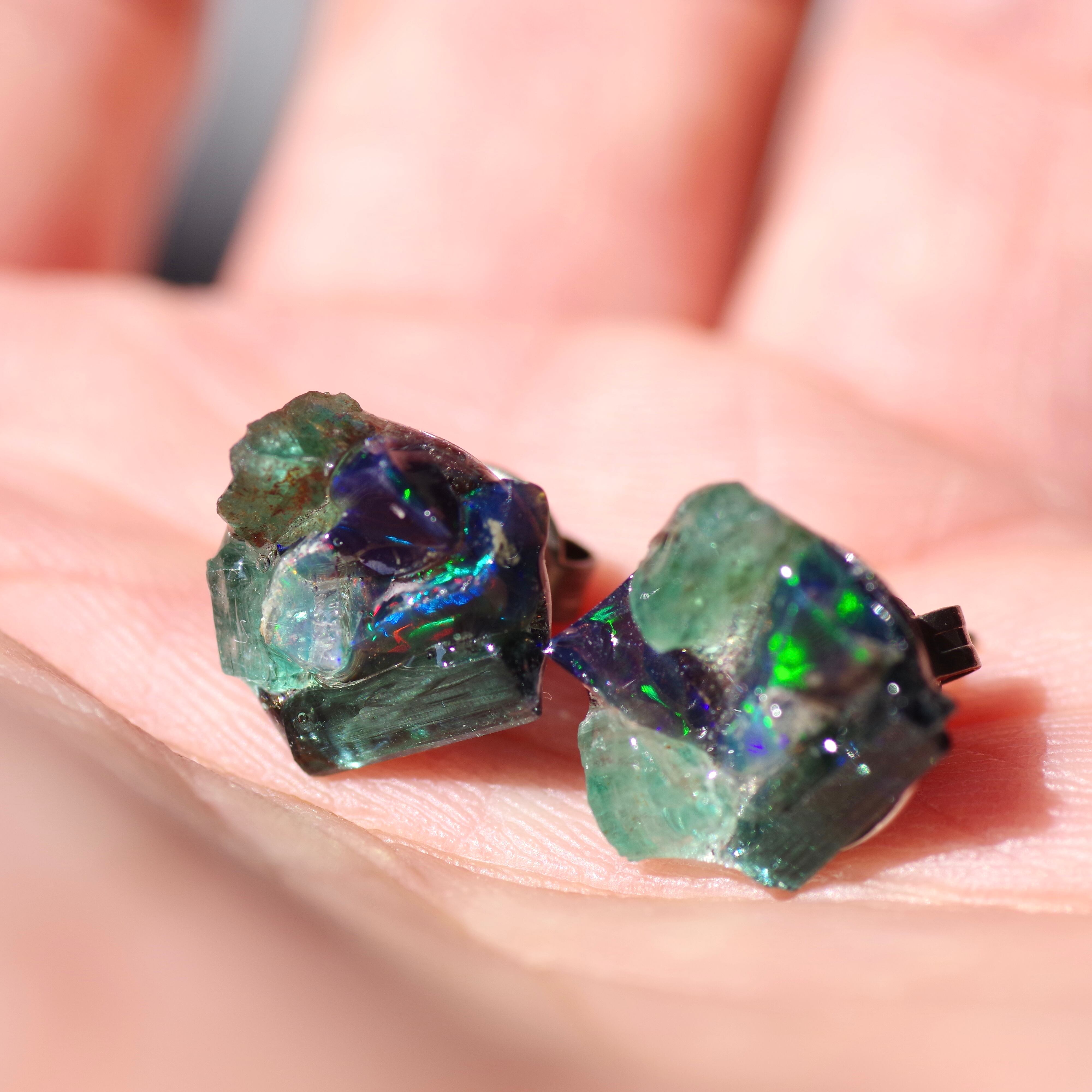 オパール × エメラルド × トルマリンの原石を使用したチタンのピアスです。
