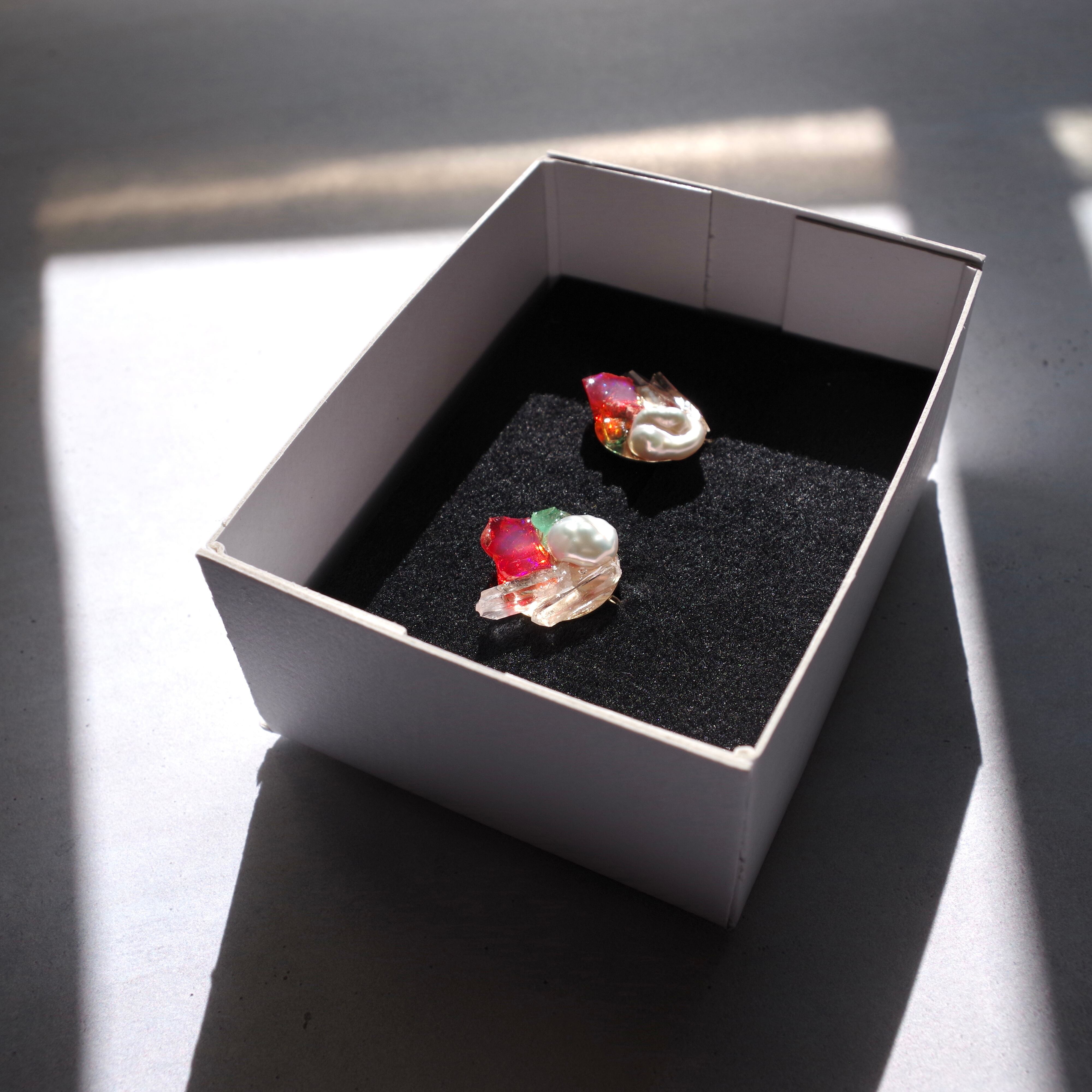 TROZOの人気シリーズ、複数の鉱物原石を組み合わせたイヤリングを2021年クリスマス特別仕様で、オパール・エメラルド・ケシパール・水晶を組み合わせました。