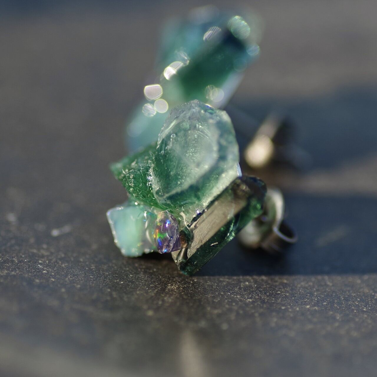 ダイアナマリアフローライト× トルマリン × アベンチュリン × オパールの原石を使用したチタンのピアスです。