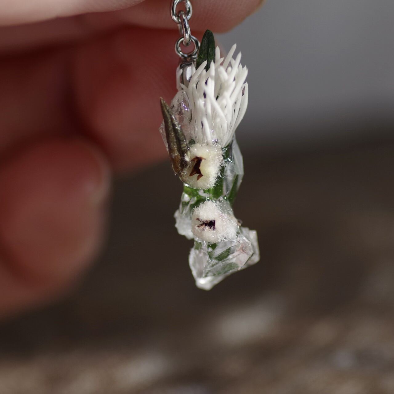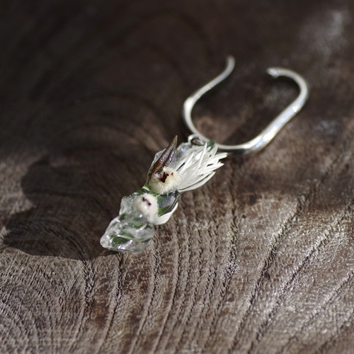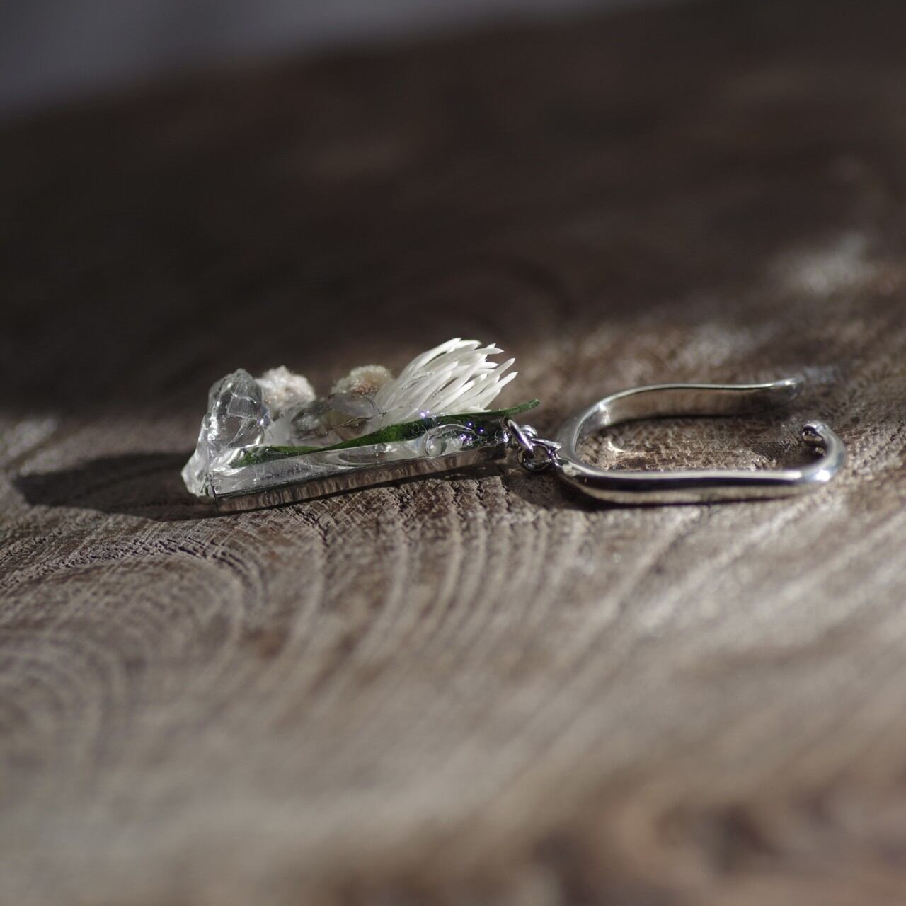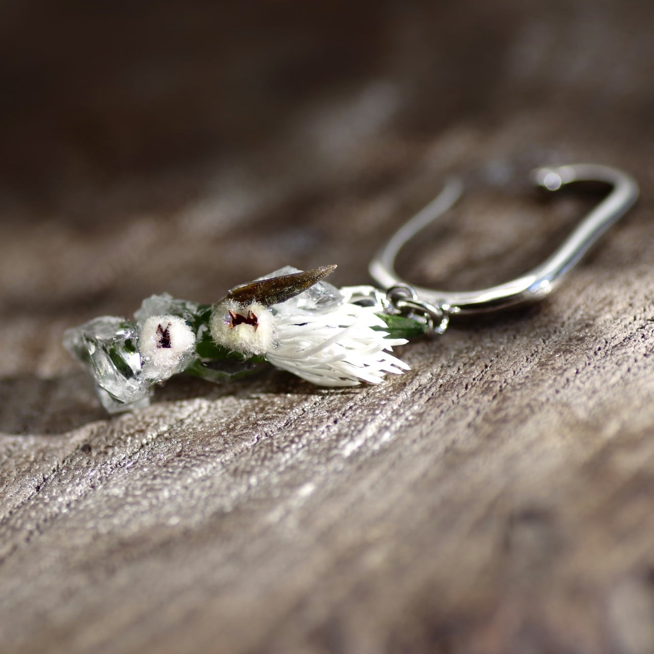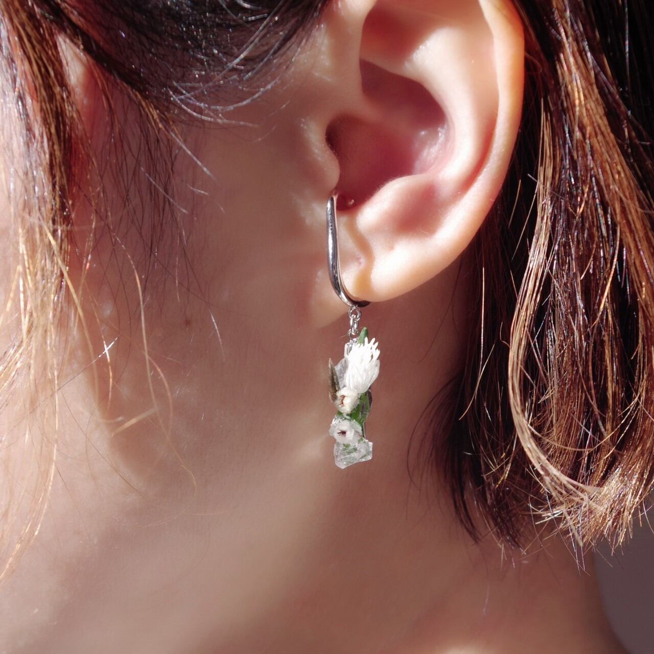 水晶の原石と植物(プリザーブドフラワー)を使用した揺れるタイプのイヤーカフです。
