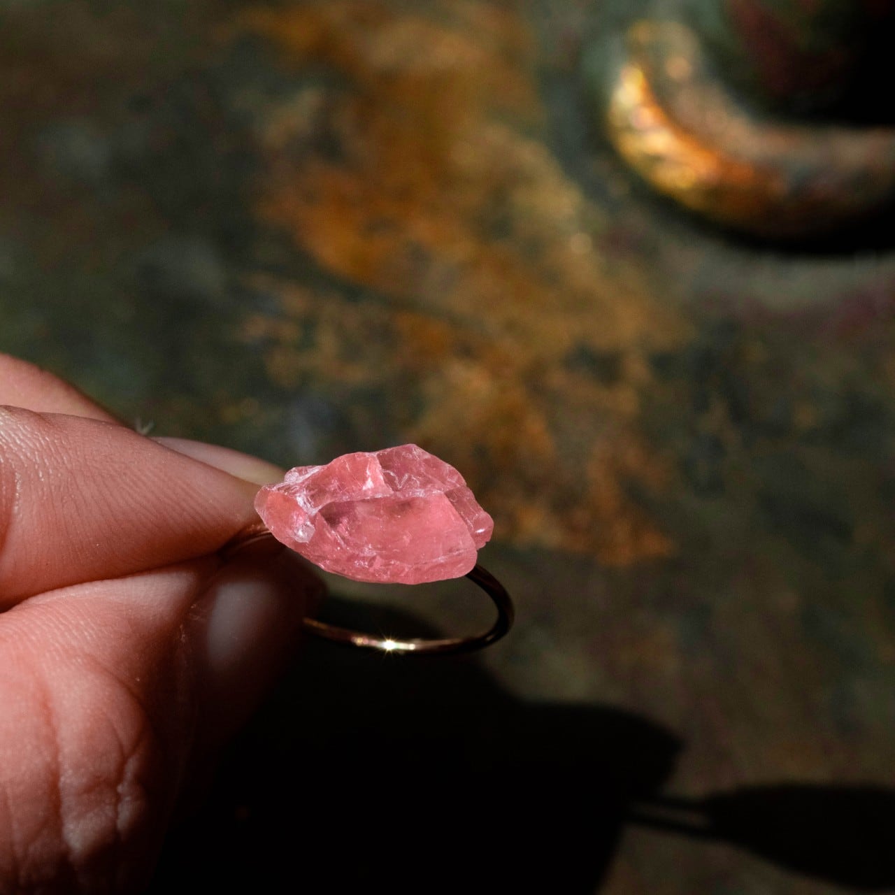 ロードクロサイトの原石を使用した14kgf もしくは シルバー925(オプションで選択)のリングです。
