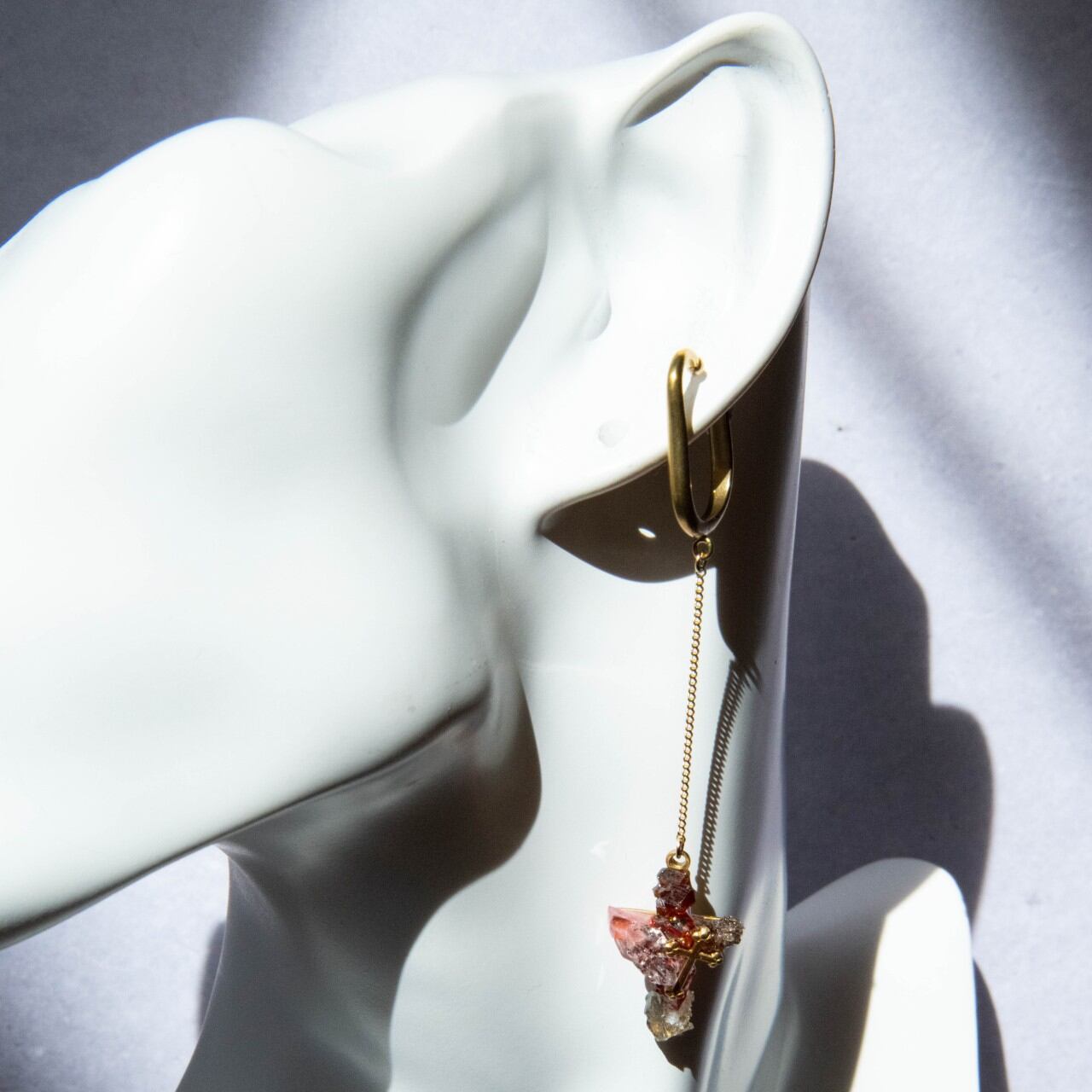 グロッシュラーガーネット × ヘマタイトインクォーツ × ロードクロサイト × オパール × モスアクアマリン × 水晶の原石を使用した揺れるタイプのイヤーカフです。チェーン付きなので耳元で揺れ動き素敵です。