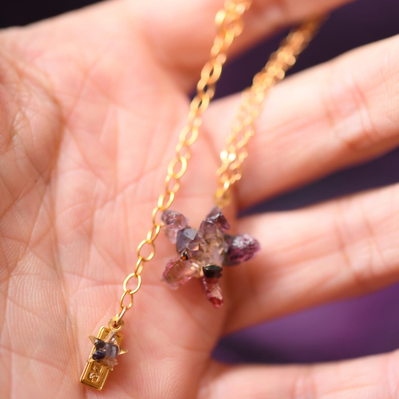 モゴック産スピネルなど、ひとつひとつ美しい原石を使用しました。角度を変えると煌めく鉱物が美しいです。