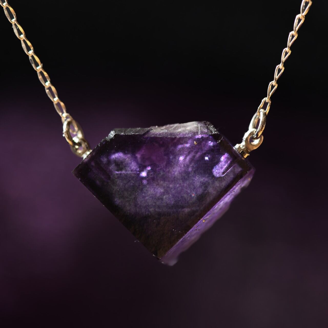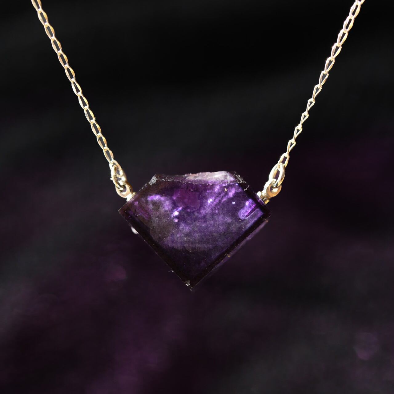 三角錐のような形で、正面から見ると左右対称に見える形状です。深い紫色で端の方が濃い色になっており、光に透かすと独特な雰囲気で美しいです。