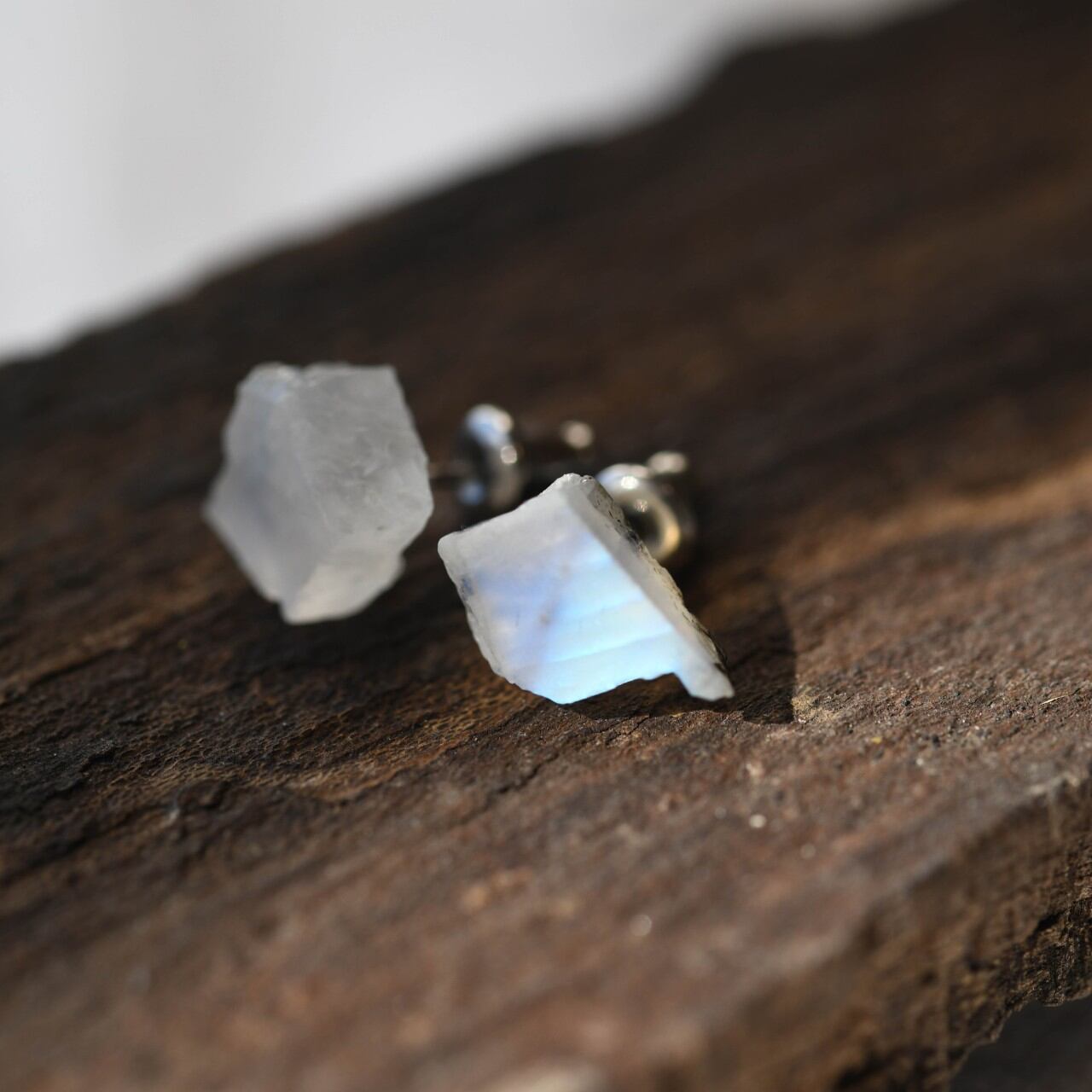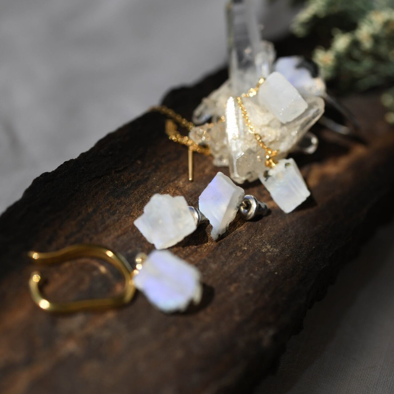 ブルームーンストーンのジュエリーです。イヤーカフ・耳飾り・ネックレス・リングを制作しました。