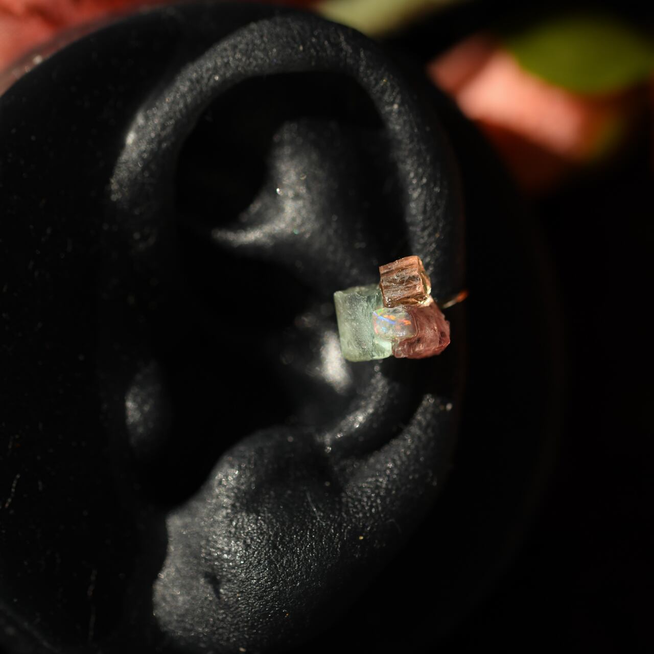 インペリアルトパーズ × オパール × アクアマリン × スピネルの原石を使用したミニサイズのイヤーカフです。