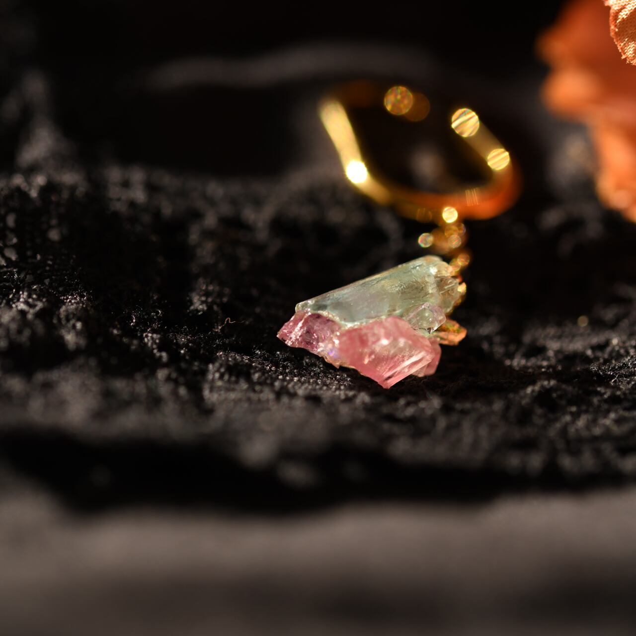 インペリアルトパーズ × ロードクロサイト × オパール × アクアマリン× スピネルの原石を使用した揺れるタイプのチェーン付きイヤーカフです。