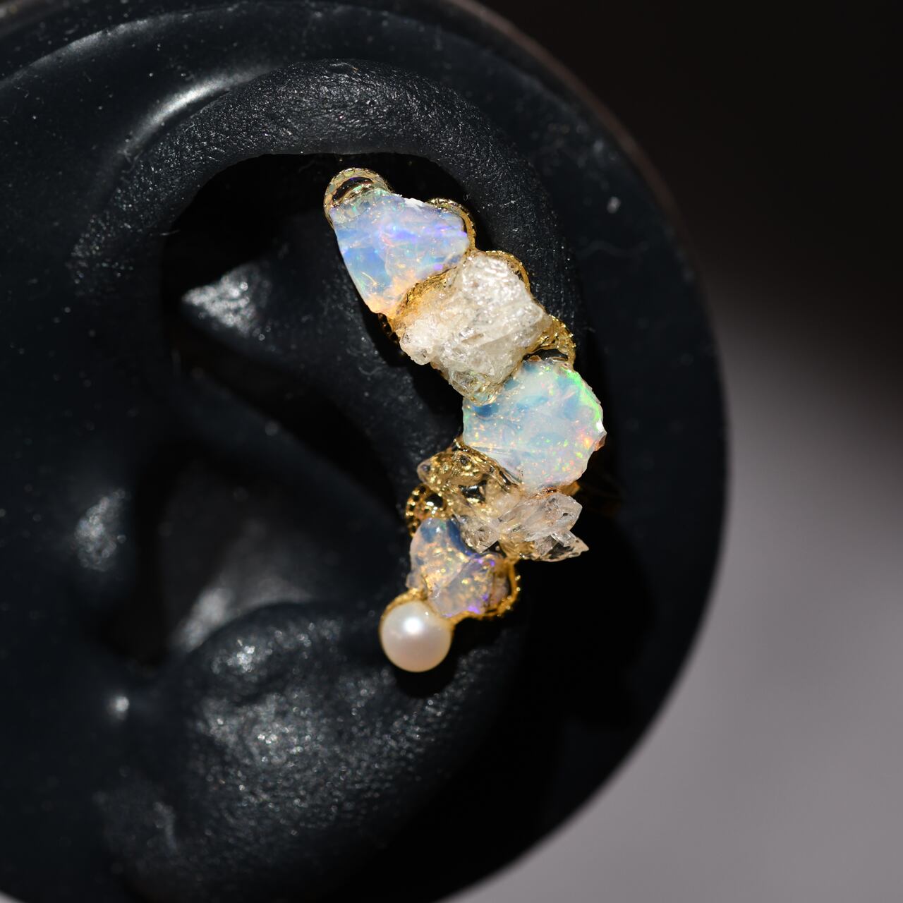オパール × 水晶 × パールの原石を使用した挟むタイプのイヤーカフです。
