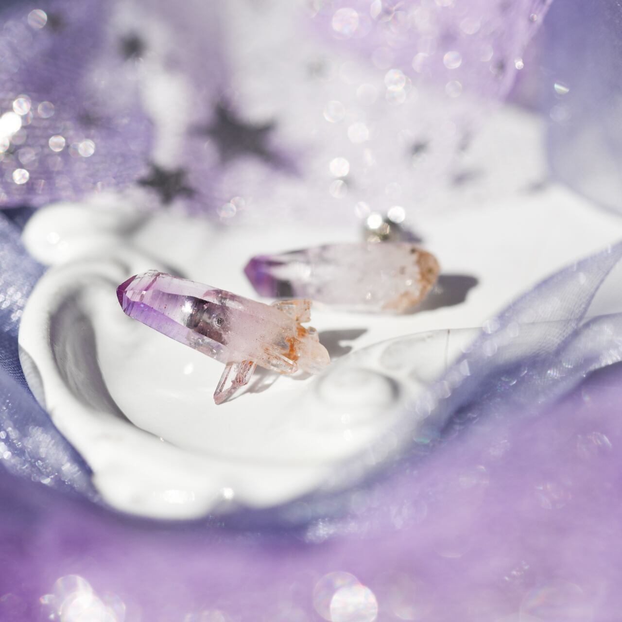 色つき水晶は不純物を含んで発色しており、アメジストはケイ素の一部が鉄イオンに置き換わったものです。