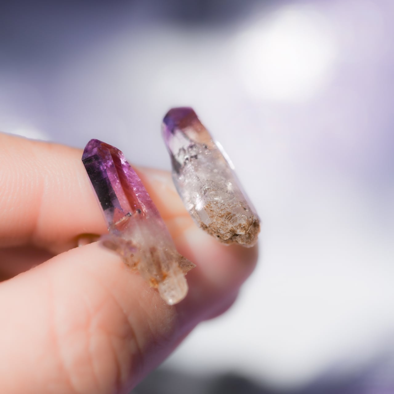 両方とも透明度が高く非常に美しい結晶です。片方は小さな結晶が付いており個性的な形です。