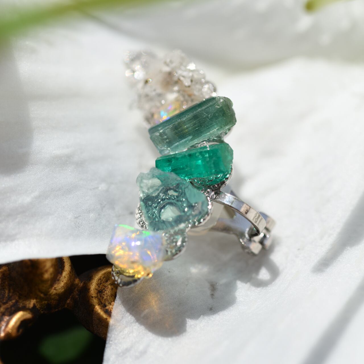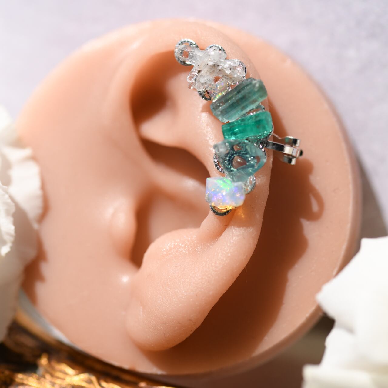 エメラルド × トルマリン × オパール × フローライト × 水晶 の原石を使用した挟むタイプのイヤーカフです。